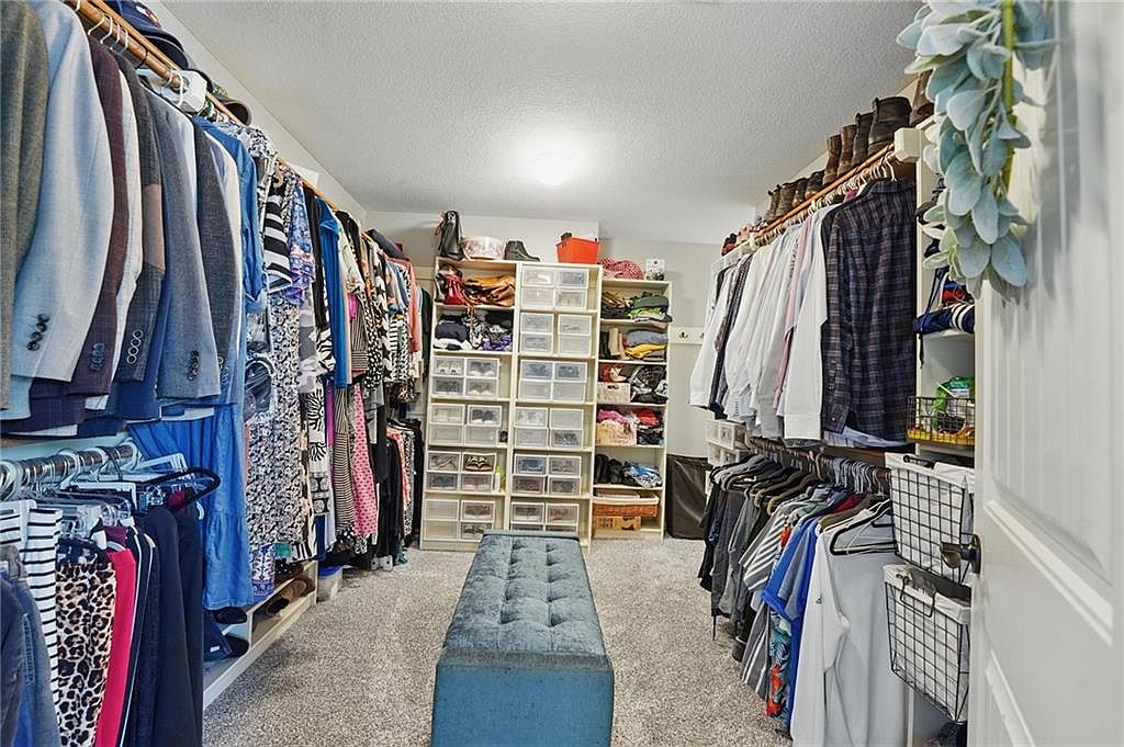 This spacious walk-in closet features a well-organized layout with clothing rods lining both walls, displaying a variety of neatly hung apparel ranging from suits and jackets to casual shirts. A soft, plush carpet covers the floor, adding warmth and comfort. Centered in the room is an upholstered blue tufted bench, perfect for sitting while dressing. At the back wall, modular shelving units with transparent drawers and cubbies provide ample storage for smaller items and shoes. The neutral wall color and bright overhead lighting create a clean, inviting atmosphere that enhances the practical sophistication of the space.