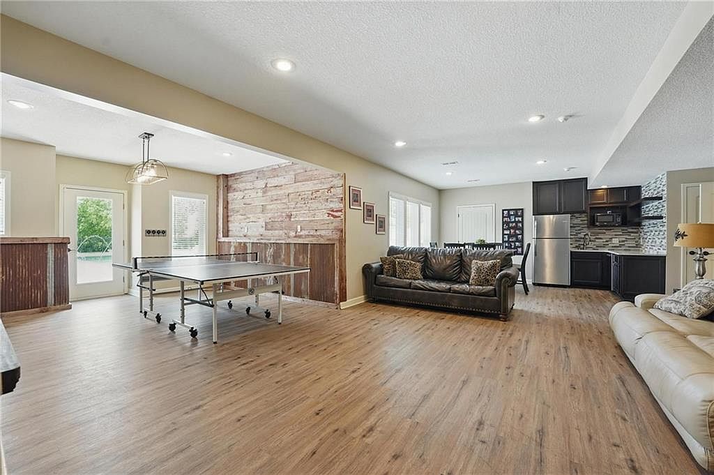 This open-plan recreational living area combines leisure and casual comfort seamlessly. The space features a ping pong table near a corner with large windows and a door that lets in natural light, enhancing the warm, inviting ambiance. The flooring is a wide plank wood-style laminate in light brown tones that complement the neutral beige walls. On one side, rustic wood paneling with a slightly distressed finish adds texture and character. The seating includes a classic dark leather couch and a beige leather sofa positioned to create a cozy conversation zone adjacent to the compact kitchen. The kitchen has dark cabinetry, stainless steel appliances, and a contemporary tiled backsplash, offering a polished contrast to the relaxed setting. Overall, the layout encourages social interaction and playful relaxation in a stylish, thoughtfully blended design.
