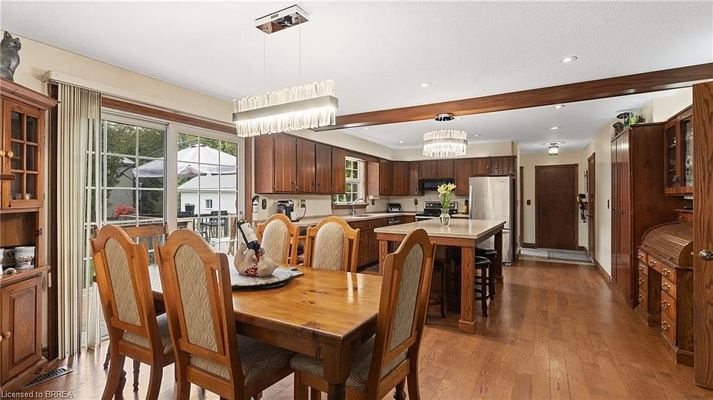 This open-concept space combines a formal dining area with a spacious kitchen, unified by warm wood tones. The dining area features a solid wood table paired with six cushioned chairs, showcasing classic upholstery patterns. Adjacent sliding glass doors provide access to the outdoor patio, inviting natural light and enhancing the room’s airy feel. The kitchen includes rich wooden cabinetry and a central island with bar seating, topped with a light-colored countertop. Stylish crystal pendant lighting fixtures add elegance overhead. Hardwood floors run throughout, complementing the traditional wood elements and creating a cohesive, inviting atmosphere.