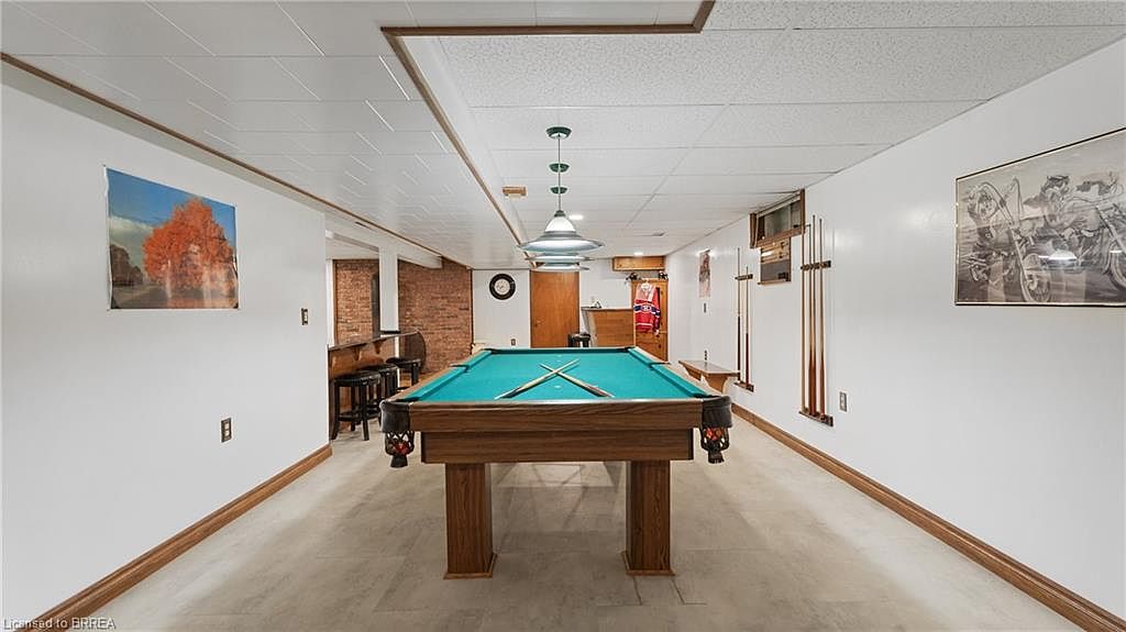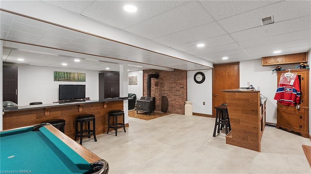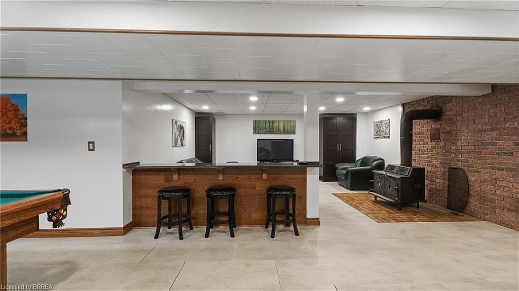 This spacious recreation room features a warm, inviting atmosphere marked by a mix of modern and rustic elements. The room boasts a large pool table in the foreground, complemented by beige tiled floors for easy maintenance. The focal point includes a wooden bar with several black leather stools, perfect for social gatherings. The ceiling above the bar and seating area is low and segmented with white tiles, illuminated by recessed lighting. A brick wall with a vintage wood stove adds character and cozy appeal. Dark cabinetry and a wall-mounted TV hint at entertainment functionality, while a wooden armoire and door introduce classic touches to this versatile space.