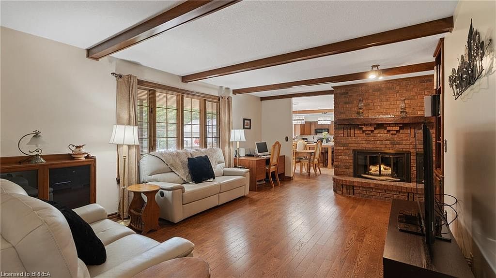 This inviting living room features warm wooden beams across the ceiling, complementing the rich hardwood flooring. Neutral walls enhance the natural light filtering through wide windows, dressed with beige curtains and wooden blinds. Comfortable cream leather sofas with dark accent pillows create a cozy seating area near a brick fireplace that anchors the room with rustic charm. A small wooden side table and two matching floor lamps add function and soft lighting. At the far end, an open doorway leads to the kitchen, where wooden cabinetry and dining chairs are visible, blending traditional and homey elements seamlessly.