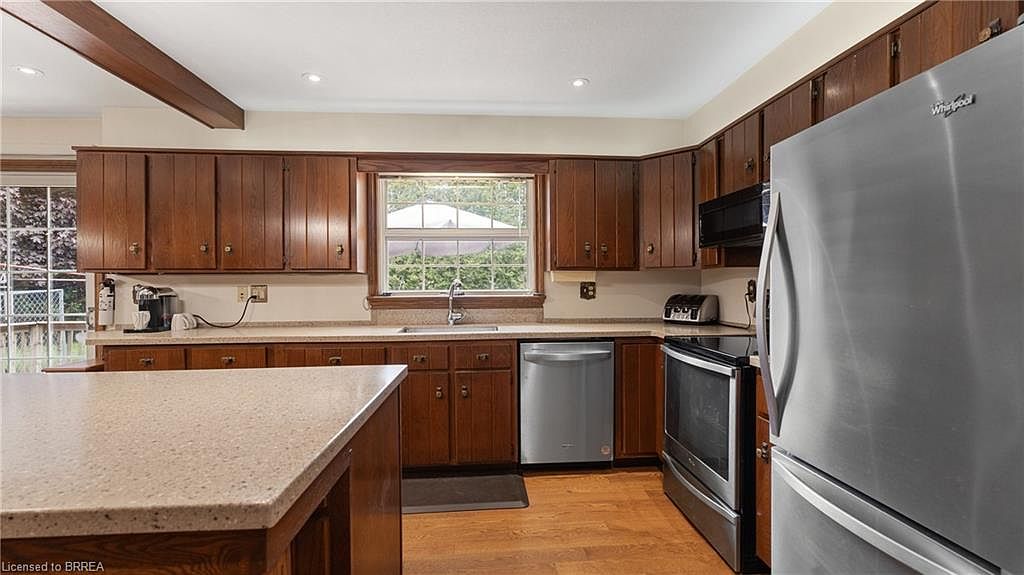 This kitchen features warm, rich wooden cabinetry paired with a light quartz countertop that offers ample workspace. The layout showcases an efficient U-shaped design, maximizing counter and storage space. Stainless steel appliances, including a Whirlpool refrigerator, dishwasher, and an electric stove with a microwave above, provide a modern touch. Natural light filters through the large window above the sink, brightening the space and connecting the interior to the greenery outside. The flooring is a warm wood tone, complementing the cabinetry, while recessed ceiling lights ensure the room is well-lit throughout.