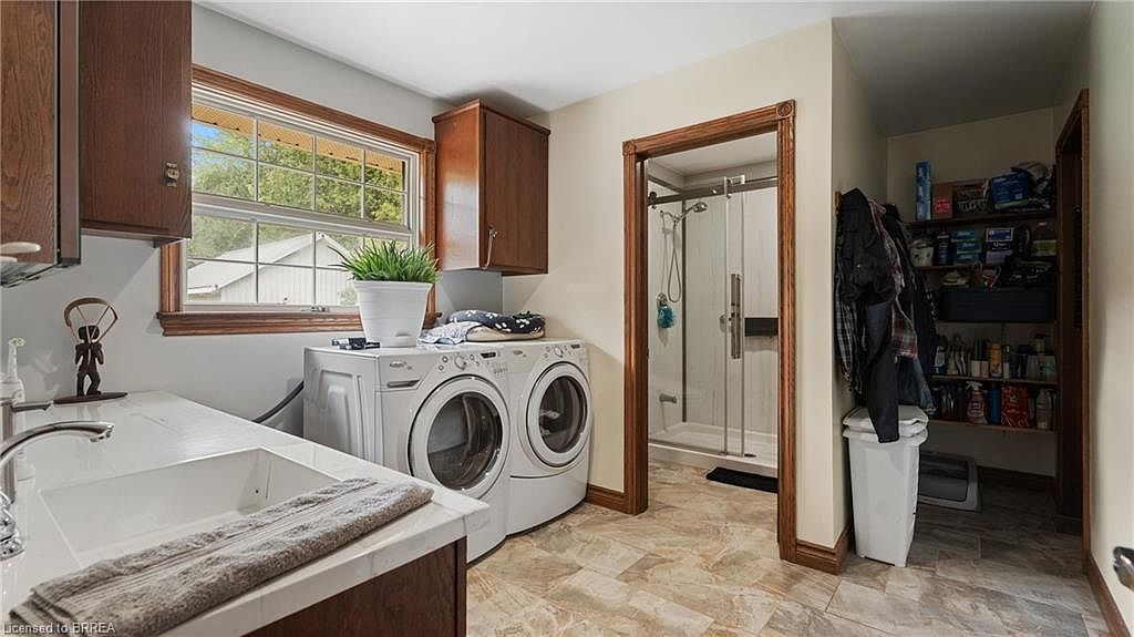 This multifunctional laundry room features a clean, organized layout with a white front-loading washer and dryer set beneath a large window trimmed in warm wood, allowing ample natural light. The countertop beside the appliances offers a smooth white surface for folding clothes, complemented by an under-mounted sink with a sleek chrome faucet. Rich wood cabinetry provides storage above and below, blending well with the natural earth-tone tile flooring. Adjacent to the laundry area, an open doorway reveals a walk-in shower with glass doors and a separate place for pantry-like storage and outerwear organization, emphasizing convenience and practicality in this utility space.