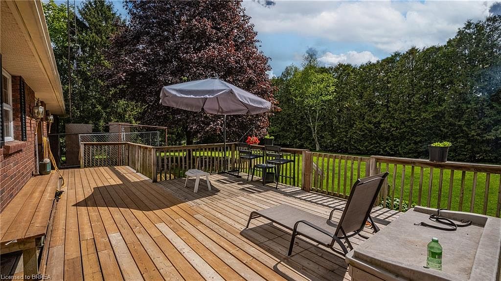 This spacious backyard deck is made of warm, natural wood planks that extend from the brick exterior of the house. The deck is bordered by a simple wooden railing, creating a safe and inviting outdoor space. A large patio umbrella provides shade over a small dining table with black chairs, perfect for casual outdoor meals. There’s a single lounge chair positioned for relaxing and sunbathing, complemented by a small white side stool. Lush green lawn and trees surround the deck, adding a sense of privacy and nature. The overall atmosphere is comfortable and casual, ideal for outdoor gatherings or quiet relaxation.