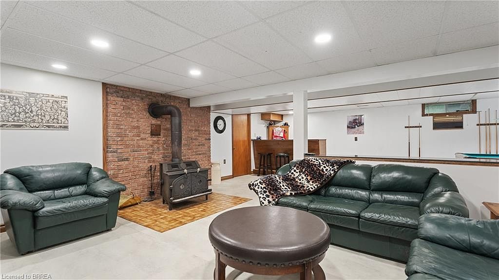 This basement lounge combines comfort and rustic charm with a spacious layout featuring a rich green leather sectional and matching armchair centered around a round leather-topped wooden coffee table. A brick accent wall showcases a traditional black wood-burning stove, adding warmth and character. The room’s white walls and ceiling tiles create a bright, clean backdrop enhanced by recessed lighting. To the right, a home bar area and pool cues hint at entertainment options, while a leopard print throw casually adds a touch of cozy, eclectic style to the space.