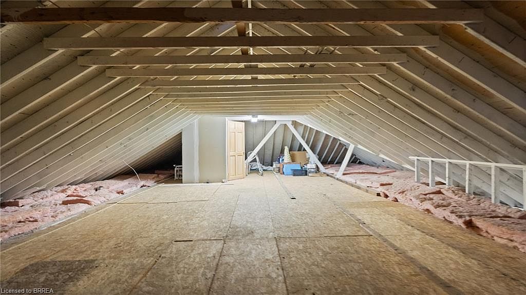 This spacious attic area features exposed wooden beams forming a classic triangular roof structure, lending a rustic and unfinished charm. The flooring is plywood, offering a sturdy surface ideal for storage or potential conversion. Pink insulation lines both sides beneath the slanting roof, suggesting energy efficiency plans. Soft neutral tones dominate, with natural wood hues and pale insulation creating a warm and utilitarian atmosphere. At the far end, an open door and scattered items hint at its current use for storage. This attic space offers versatile utility within the home’s architecture, maximizing under-roof space.