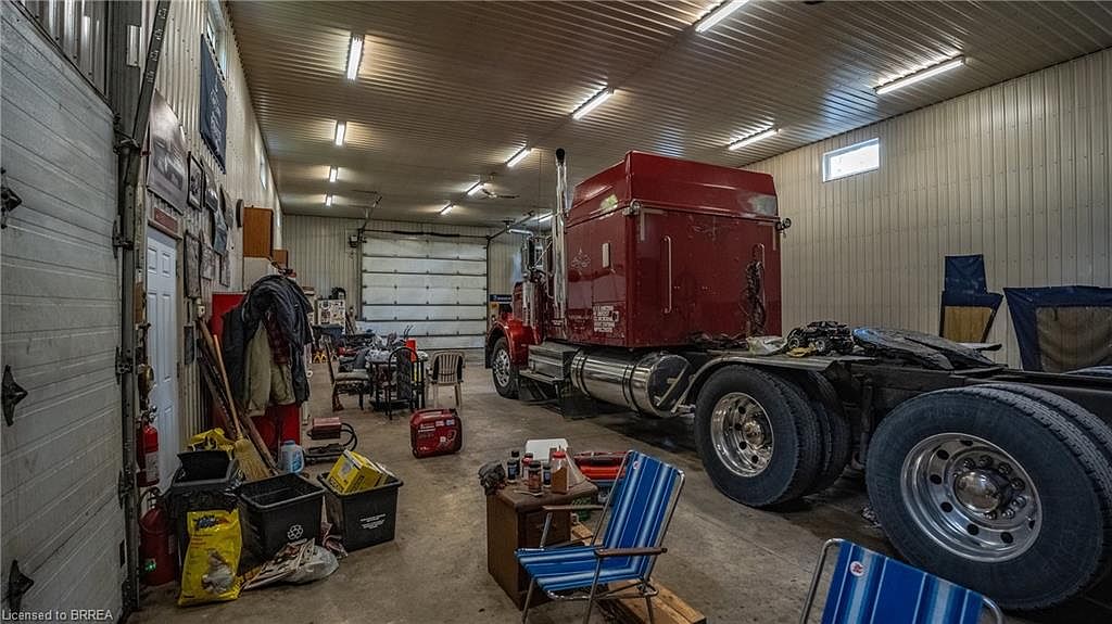 This expansive garage area features high ceilings and metal panel walls painted in a neutral light gray, creating a utilitarian yet organized atmosphere. The space is illuminated by overhead fluorescent lights evenly spaced for ample lighting. A large red semi-truck is parked along one side, emphasizing the room’s function as a storage and maintenance area for heavy vehicles. Various tools, boxes, chairs, and a small table cluster near the entrance, lending a casual workshop vibe. The concrete floor is durable and fits the practical, industrial design, while small windows near the ceiling bring in natural light to balance the enclosed space.