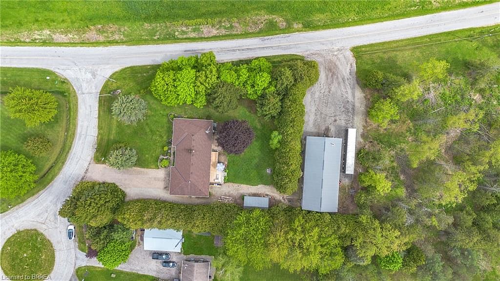This expansive aerial perspective reveals a charming rural estate set amidst lush greenery. The main house, centrally positioned with a brown roof, showcases a traditional rectangular layout complemented by a spacious front yard and well-maintained lawn. Neighboring the house, a large gray outbuilding indicates additional functional space, possibly for storage or vehicles. The property is bordered by dense clusters of mature trees and shrubbery, creating privacy and a natural buffer. Roads frame the estate on two sides, and driveways lead to both the house and outbuilding, highlighting easy accessibility within a serene, green landscape.