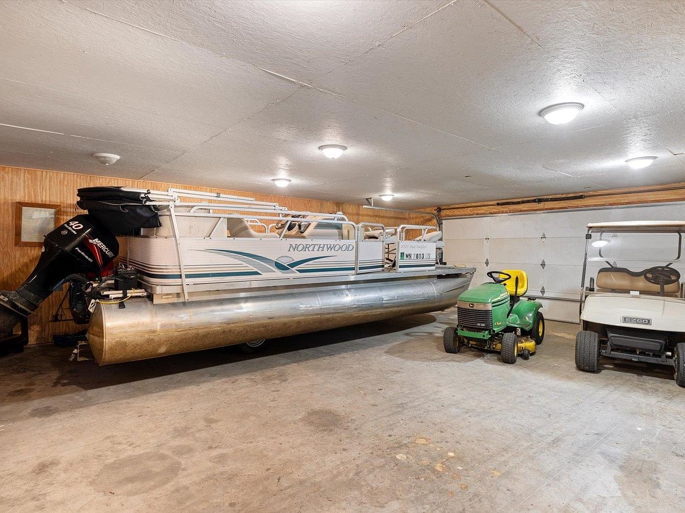 This spacious garage features practical concrete flooring suited for heavy equipment and vehicles. The ceiling is low with multiple flush-mounted lighting fixtures providing ample brightness. The walls are paneled with light wood, adding a warm touch to the otherwise utilitarian space. A large pontoon boat with visible seating and outboard motor takes up significant space. Next to it, a green John Deere lawn tractor and a white golf cart are parked side-by-side, displaying the home’s readiness for outdoor activities. The garage door is a traditional double door, ideal for accommodating large wheeled vehicles.
