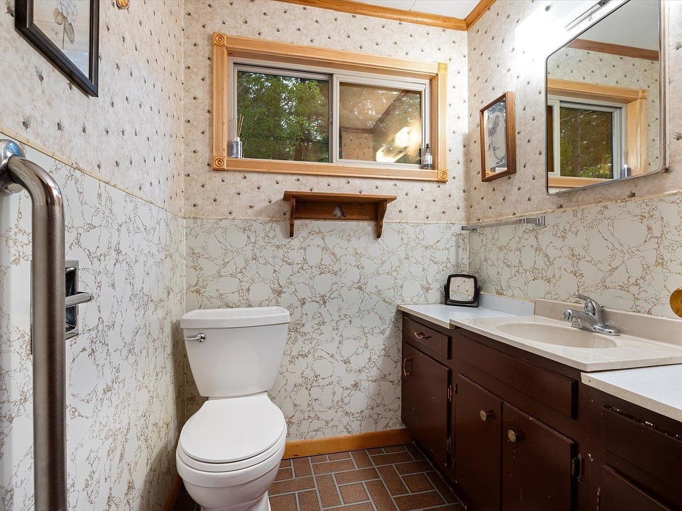 This compact bathroom features a blend of vintage and practical design elements. The walls are covered halfway with marble-patterned paneling, transitioning to wallpaper dotted with a small bee motif above. A rectangular window framed in natural wood allows natural light to filter in, creating an airy feel. The white toilet sits beside a dark wood vanity cabinet topped with a simple beige countertop and integrated sink. Above the sink is a large rectangular mirror with a chrome-framed light, emphasizing brightness. Earth-toned tile flooring with a brick-like pattern complements the warm wood trim and adds a grounded texture to the space.