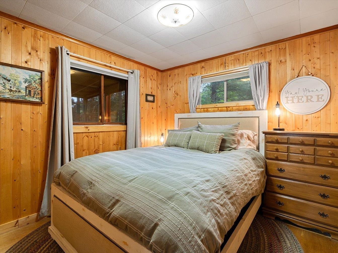 This bedroom features warm, natural wood-paneled walls that create a cabin-like, inviting atmosphere. The bed is centrally placed with a cushioned headboard, dressed in muted green bedding with matching decorative pillows for a calm, soothing vibe. Two windows with light gray curtains allow natural light and offer views of surrounding greenery. On one side, a wooden dresser provides storage with classic drawer pulls, topped with a small lamp emitting a soft glow. The room’s ceiling light has a floral design that adds a subtle decorative touch, completing the homey, rustic aesthetic.