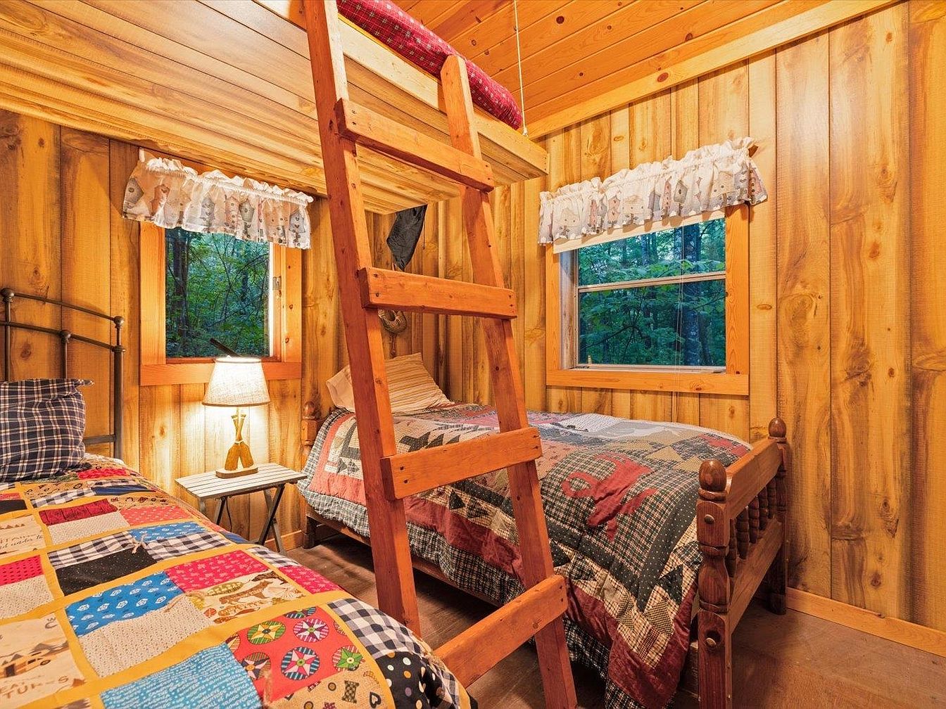 This intimate bedroom features warm, natural wood-paneled walls and ceilings, creating a rustic cabin atmosphere. Two twin beds with sturdy wooden frames occupy the space, each adorned with patchwork quilts that add colorful, homey charm. A wooden ladder leans against one bed, suggesting an upper bunk or loft bed above, maximizing space efficiently. Two windows framed in wood offer views of lush greenery outside, brightening the room with natural light. A small bedside table with a lit lamp adds a cozy touch, emphasizing simplicity and comfort in a woodsy retreat setting.