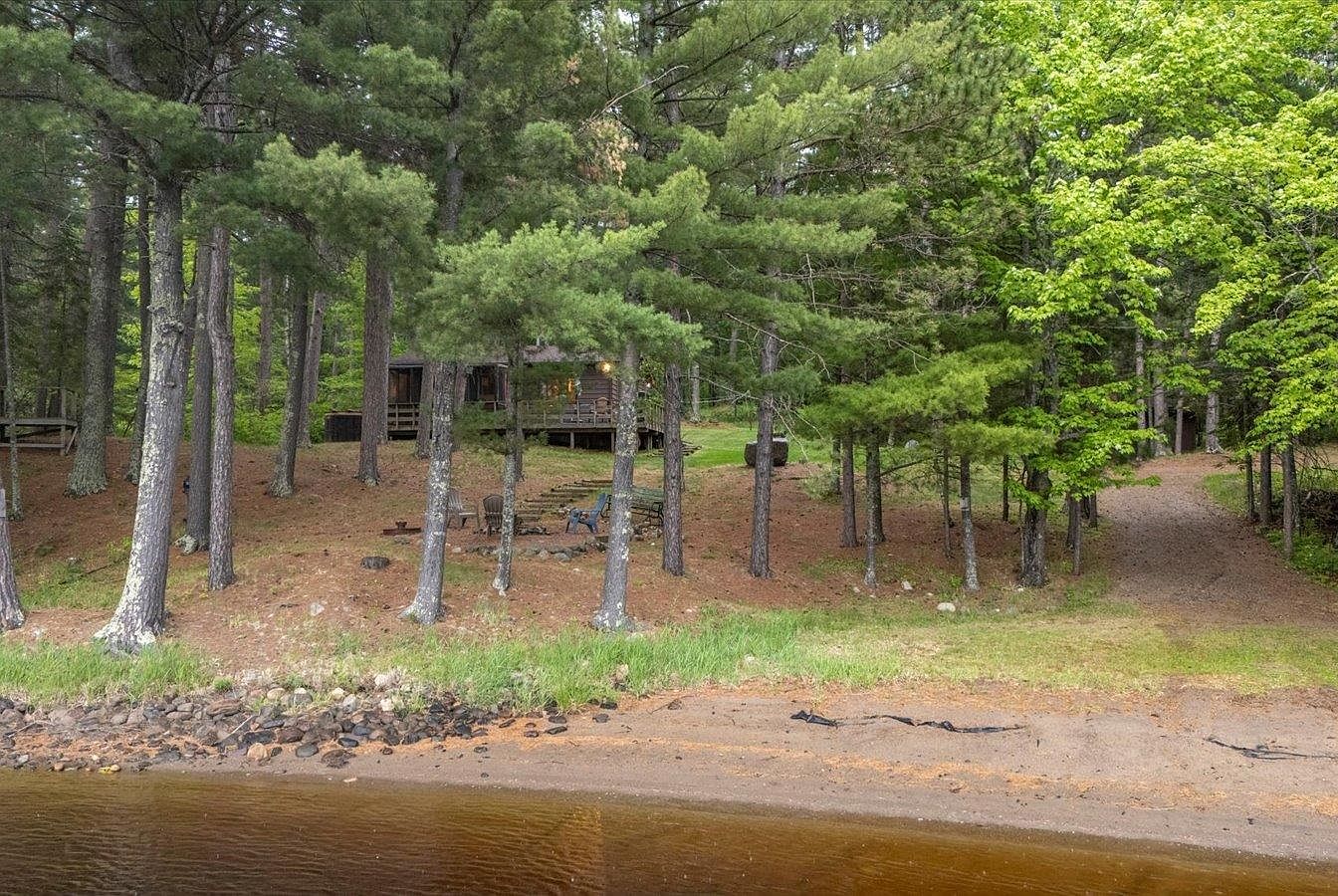 This serene lakefront yard offers a peaceful retreat surrounded by tall pine and leafy green trees. The gentle slope leads down to a sandy shoreline edged with smooth rocks, creating a natural boundary to the water. Nestled amid the foliage is a cozy cabin with a rustic wooden deck, perfect for enjoying the tranquil environment. The outdoor area includes a stone-bordered fire pit encircled by Adirondack chairs, ideal for evening gatherings. A dirt pathway meanders through the trees, adding to the secluded, forested charm of this inviting waterfront space.