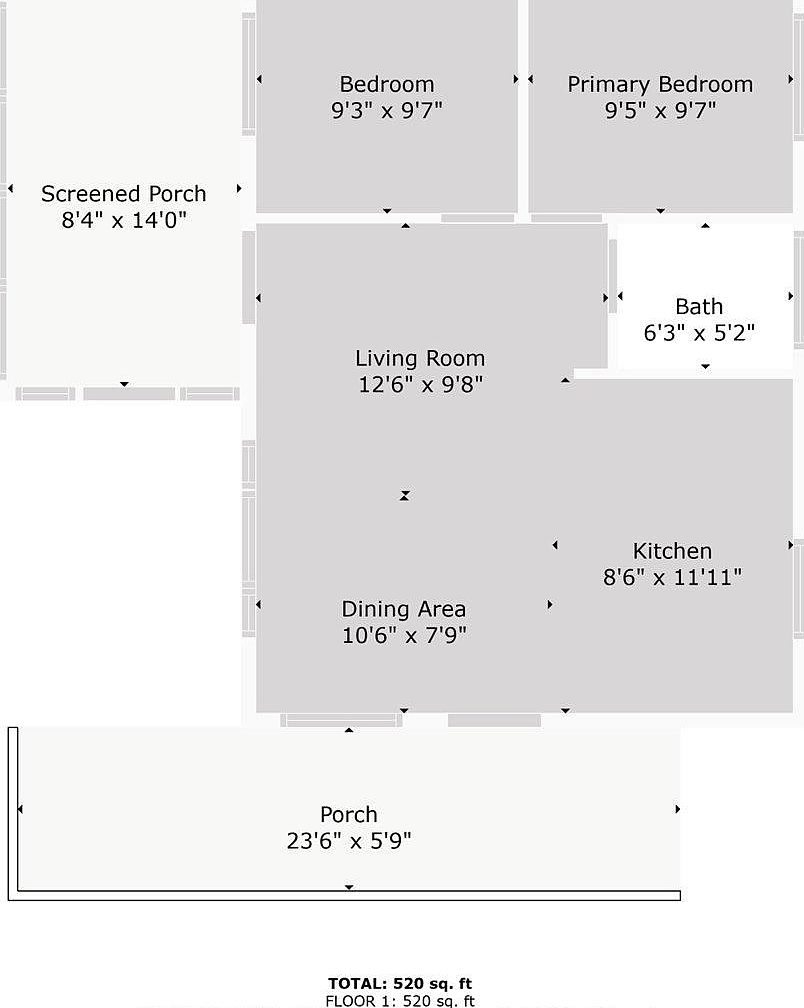 This compact layout features a well-organized flow between living spaces, maximizing a total area of 520 square feet. The living room, measuring 12’6″ by 9’8″, forms the central hub adjacent to the dining area, contributing a cozy communal atmosphere. The kitchen is efficiently designed at 8’6″ by 11’11”, providing ample workspace along one side. Two bedrooms, including a primary room and standard bedroom, are situated side by side, each close to the centrally placed bathroom. The screened porch and front porch extend living space outdoors, enhancing comfort and natural light. Overall, the plan emphasizes efficient use of space with clear separation of private and social areas.