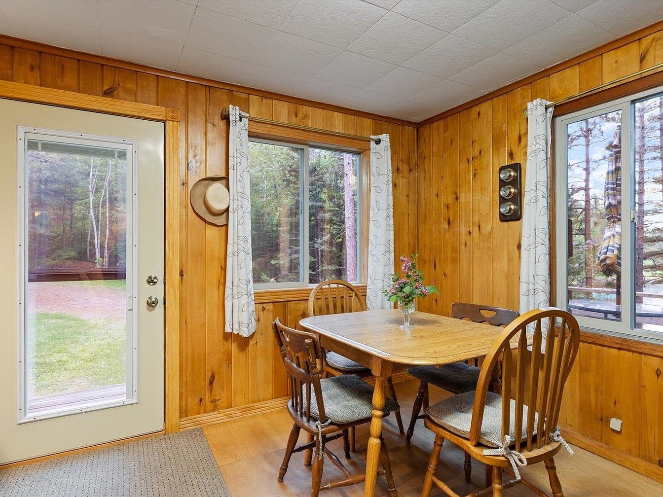 This intimate dining nook offers a charming rustic ambiance with its rich honey-toned wood paneling enveloping the walls, complemented by warm wooden flooring. The space features a classic rectangular wooden table surrounded by mismatched traditional chairs with cushioned seats, creating a casual, inviting atmosphere. Large windows on two sides invite ample natural light and provide serene views of lush greenery and tall trees outside, enhanced by simple white curtains with subtle floral patterns. A glass-paneled door leads to an outdoor area, integrating indoor comfort with nature, while a small floral centerpiece adds a touch of freshness to the table.