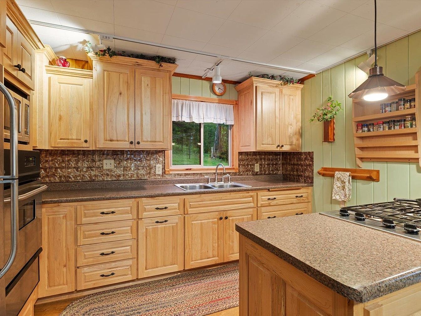This cozy kitchen features warm honey-toned wooden cabinetry with black handles, complementing the speckled brown countertops that extend onto a handy island. The backsplash is adorned with dark bronze embossed tiles, adding texture and a vintage charm. Soft sage-green vertical paneling surrounds the room, contrasting gently with the wood. A double stainless steel sink sits beneath a window dressed with a white ruffled curtain, offering a serene view of greenery outside. Functional elements include a built-in oven, a gas stovetop on the island, and a spice rack neatly mounted on the wall, emphasizing both practicality and rustic character.