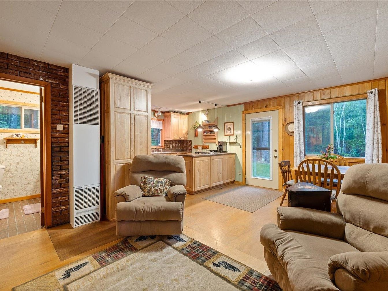 This warm and inviting space combines a compact kitchen with an adjoining living area. Soft beige recliners with plump cushions face outward, framing a rustic rug adorned with nature-inspired motifs. The kitchen features light wood cabinetry and a subtle green accent wall, enhancing the natural, cabin-like charm of the room. Two pendant lights hang above the counter, adding focused lighting. Wood-paneled walls and window frames echo throughout, creating a cohesive, earthy palette. A glass door and large window reveal lush forest views, connecting the cozy interior with the outdoors. The layout encourages relaxed living and casual dining.