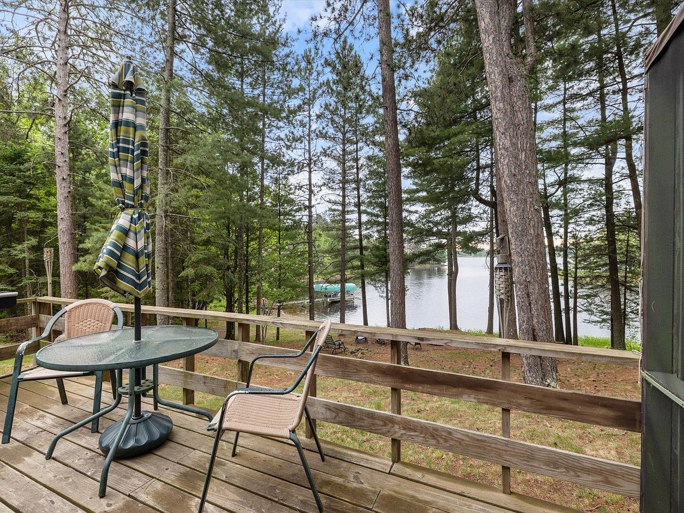 This wooden deck provides a peaceful outdoor seating area, featuring a round glass table with a striped, folded umbrella and two matching woven chairs with black metal frames. The deck is surrounded by a simple wooden railing, blending naturally with the forested backyard. Tall pine trees frame a serene lake view, visible through the trees, creating a tranquil retreat. The ground is covered with pine needles and sparse grass, enhancing the rustic cabin vibe. This space offers a quiet spot to relax and enjoy nature, with ample shade from towering conifers and the soft blue sky above.