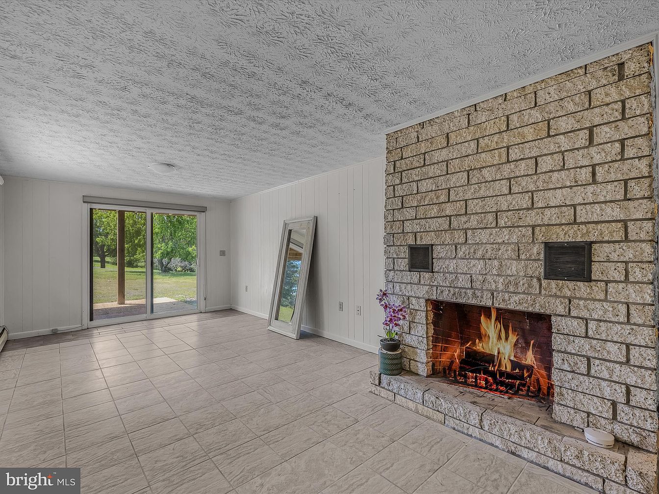 This inviting family room features a large stone brick fireplace that anchors the space, with a warm fire adding a cozy ambiance. The room is spacious and open, with light-colored tile flooring that complements the white paneled walls and textured ceiling. A full-length mirror leaning against the wall enhances the airy atmosphere and reflects natural light streaming in through the sliding glass doors. These doors open to a serene outdoor view, creating a seamless transition between indoor and outdoor living. The layout encourages relaxation and gatherings, emphasizing comfort with a touch of rustic charm.