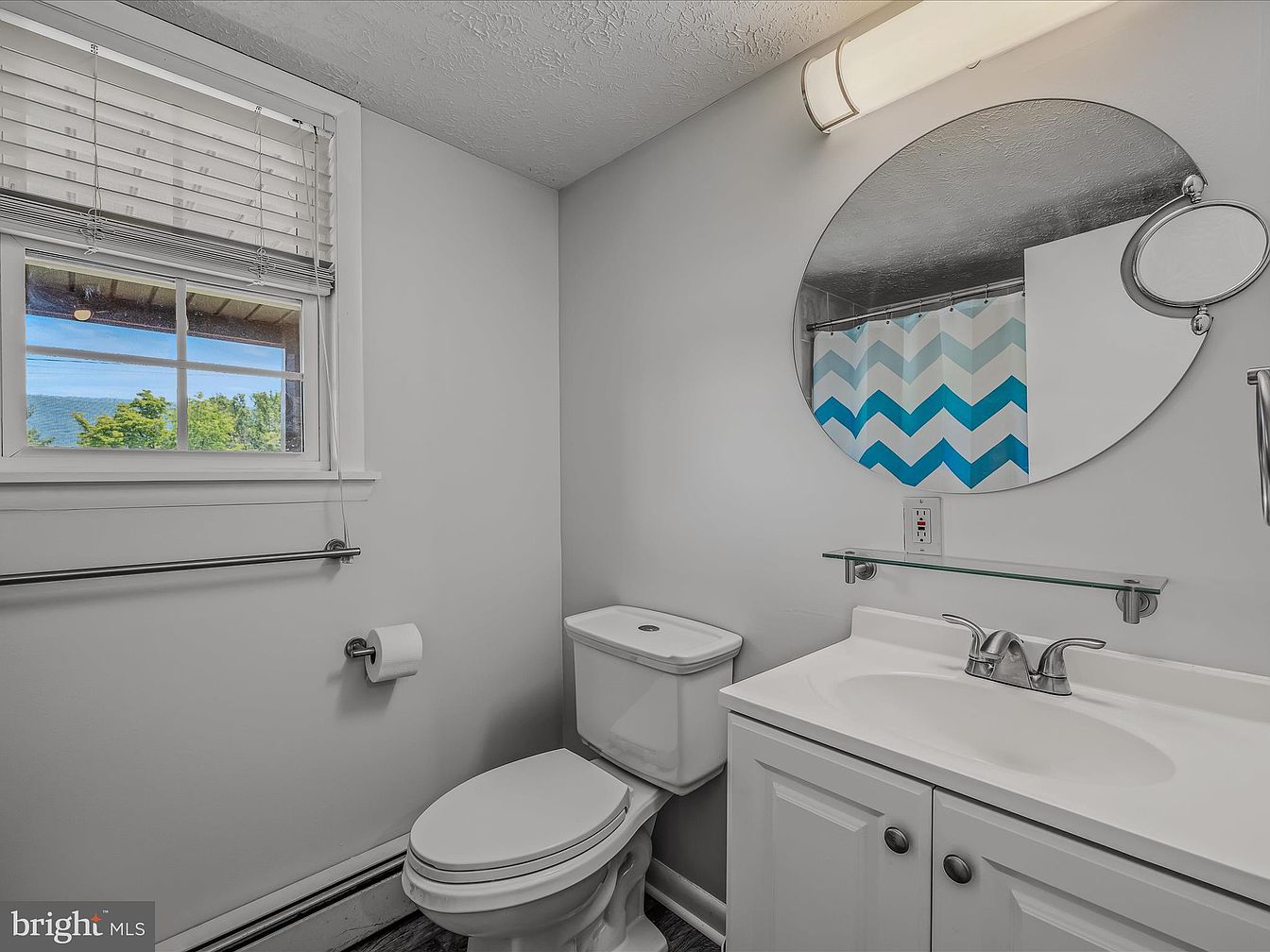This compact bathroom features a clean, minimalistic design with white walls and cabinetry that create a bright, airy atmosphere. The vanity includes a white countertop basin with a modern chrome faucet, paired with two white paneled cabinet doors below for storage. Above, a large round mirror with an attached smaller magnifying mirror adds a contemporary touch and practicality. A narrow glass shelf beneath the mirror offers additional space for toiletries. A small window with white blinds allows natural light to enter while a chevron-patterned blue shower curtain adds a subtle pop of color to the space.