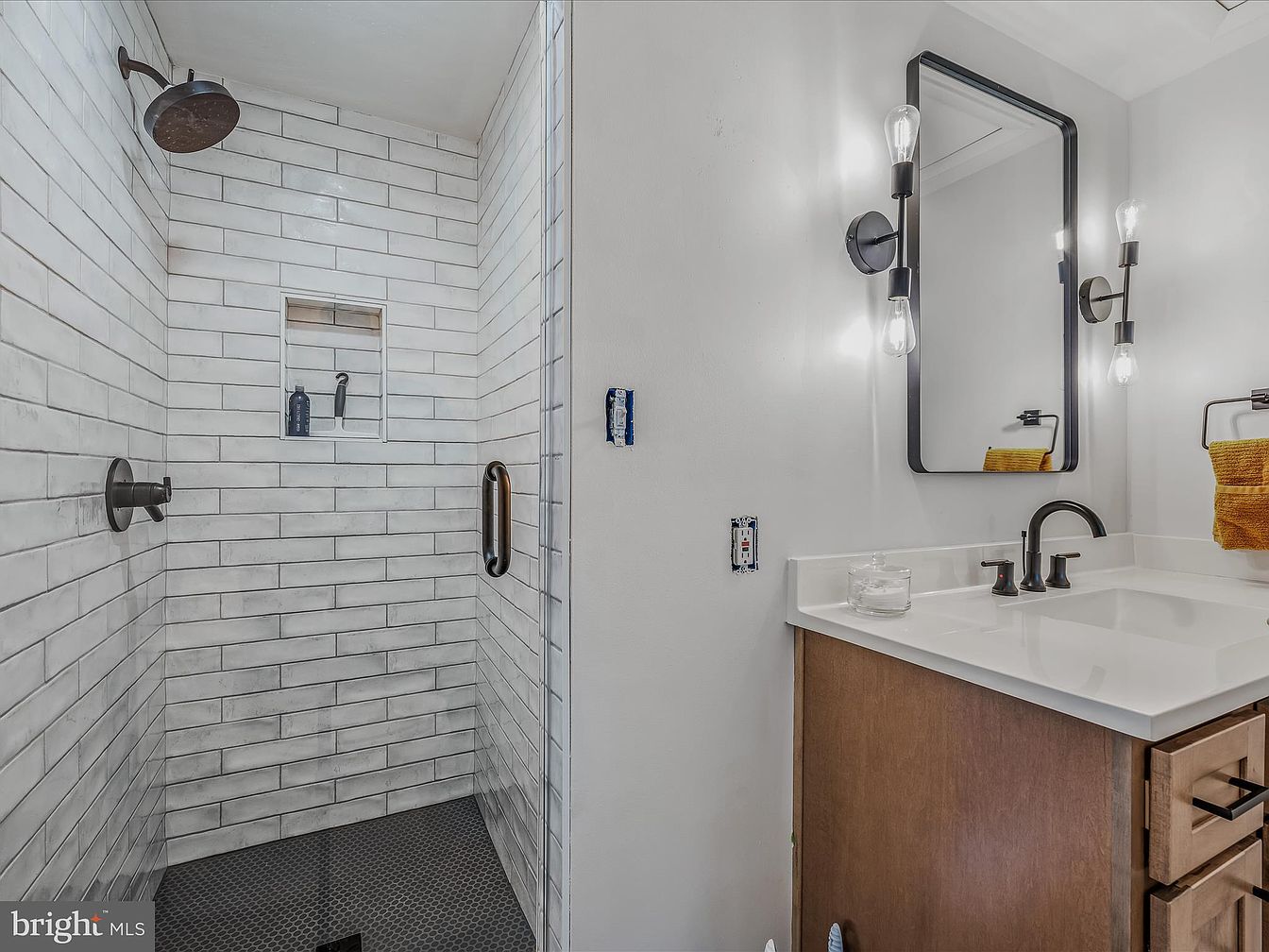 This bathroom corner combines a walk-in shower and a vanity area. The shower features white rectangular subway tiles with subtle gray marbling, arranged in a horizontal brick pattern, creating a clean, modern look. The shower floor is covered with small, black hexagonal tiles, adding contrast and texture. Matte black fixtures, including a showerhead, handle, and grab bar, complement the overall aesthetic. Adjacent, the vanity has a warm wooden cabinet topped with a sleek white countertop and integrated sink. Black industrial-style lighting fixtures flank a minimalist rectangular mirror, adding functionality and style. A mustard yellow towel adds a pop of color on the metal towel rack.