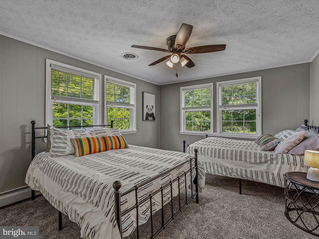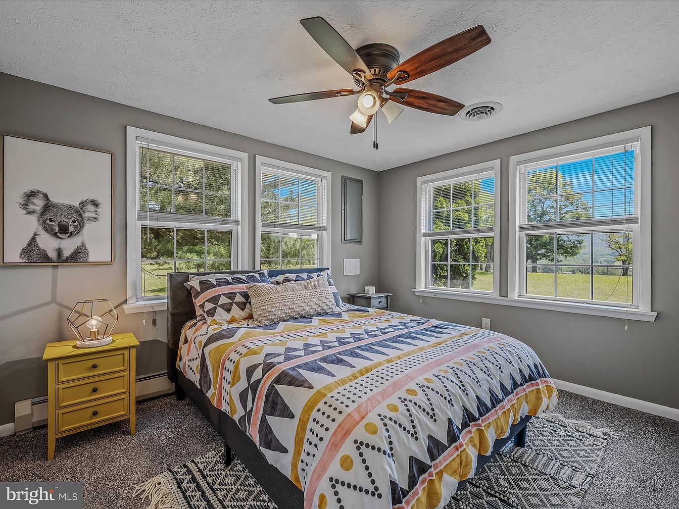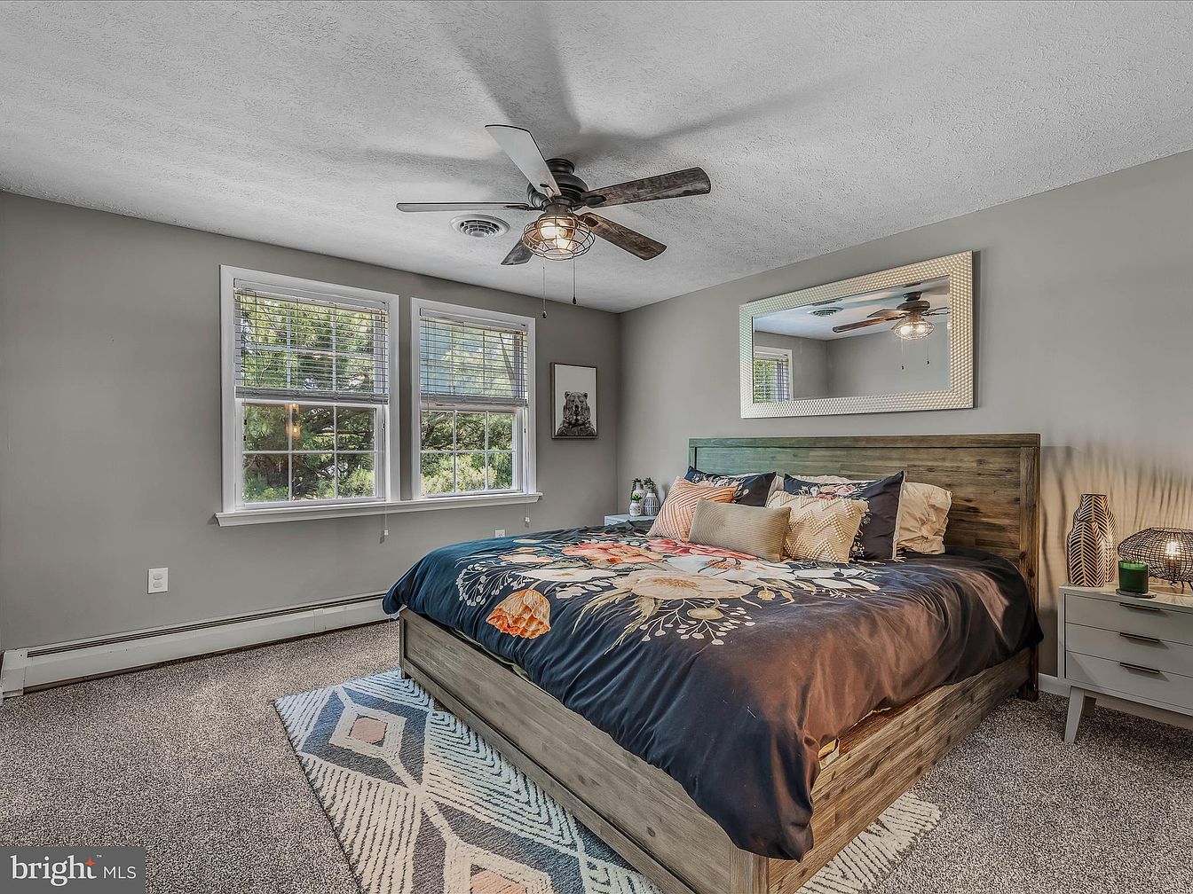 This master bedroom features a cozy, rustic-modern aesthetic with a wood-framed bed as the centerpiece, topped with a rich floral-patterned comforter in deep navy and warm floral hues. The walls are painted in a calming light gray, complemented by a soft, textured carpet that covers the floor. A geometric patterned area rug extends partially beneath the bed, adding visual interest and layering. The room is illuminated by natural light streaming in from two large, white-trimmed windows with blinds. A textured wall mirror and subtle decorative pieces on the nightstand enhance the space’s inviting, tranquil atmosphere. A ceiling fan with dark blades and a cage-style light fixture adds functional style.