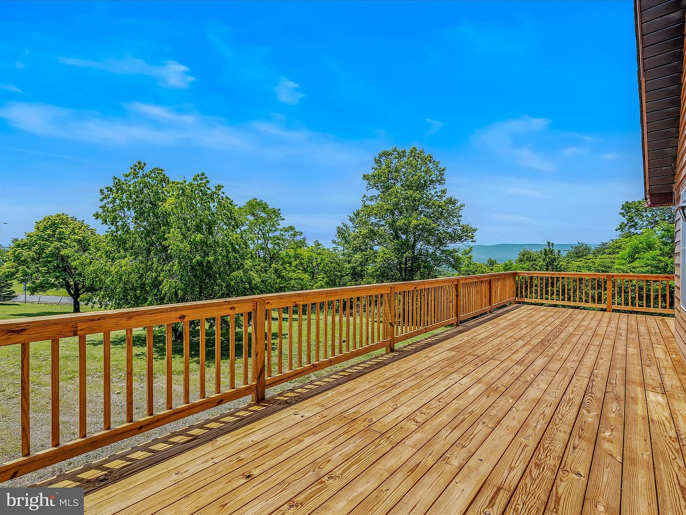 This expansive outdoor deck is crafted from natural wood, bringing warmth and rustic charm to the home’s exterior. The flooring consists of wide wooden planks laid horizontally, showcasing the wood grain and knots, enhancing the natural aesthetic. A sturdy rail system with evenly spaced vertical balusters encloses the deck, offering safety while allowing unobstructed views of the surrounding lush greenery and open sky. The deck extends from the side of the house, which is clad in matching wood siding. This space invites outdoor relaxation and entertaining, perfectly blending nature with comfortable design.