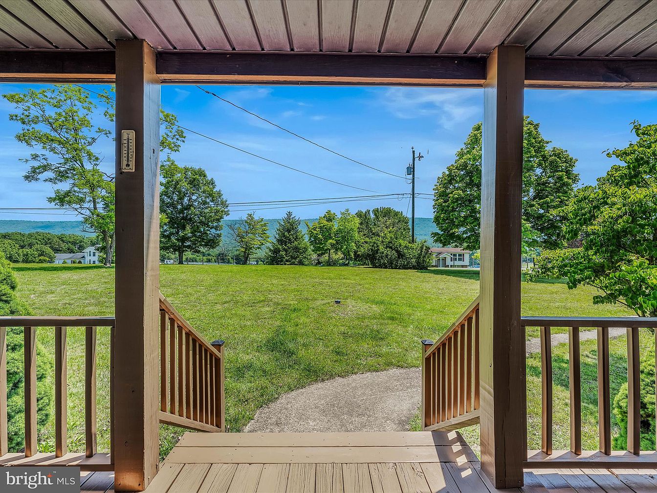 The front porch offers a welcoming transition from indoors to outdoors, framed by sturdy wooden railings and posts painted in a warm earthy brown. The ceiling above is clad in horizontal panels that add texture and depth while providing shade. Beyond the porch, a gently curving concrete walkway leads through a spacious, well-maintained lawn dotted with mature trees, enhancing the serene and natural ambiance. The bright blue sky and distant rolling hills create a soothing backdrop, suggesting a peaceful countryside setting perfect for relaxing afternoons and enjoying nature’s beauty.