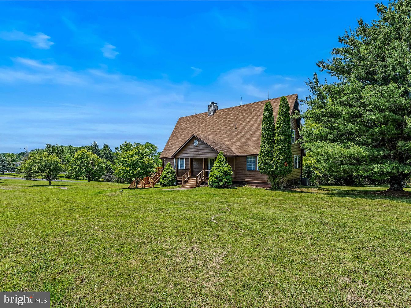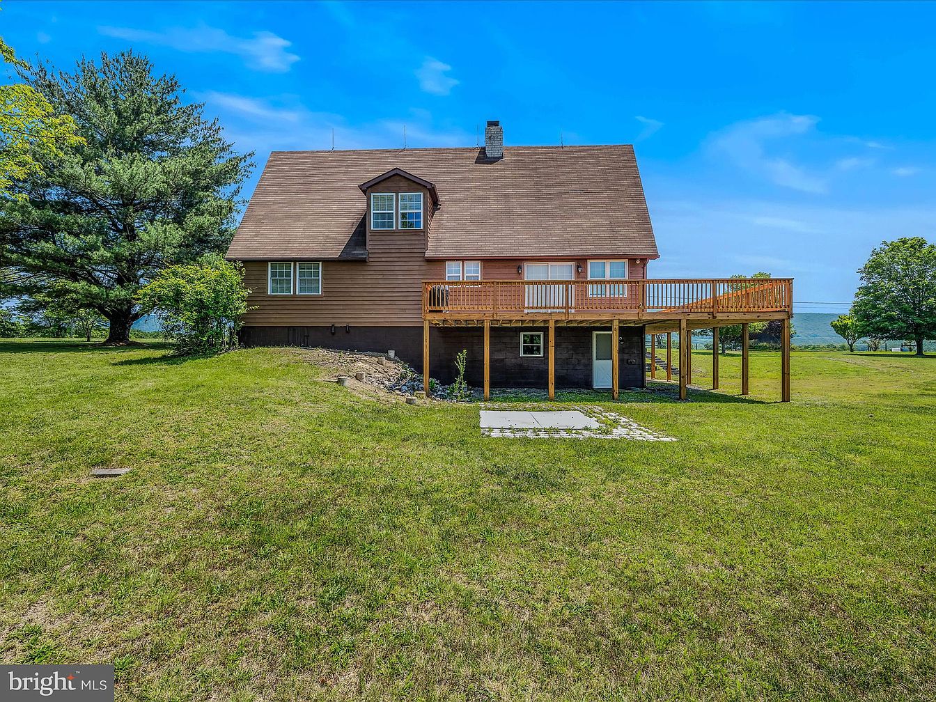 This view highlights the back exterior of the home featuring a spacious elevated wooden deck that extends across one side, ideal for outdoor relaxation or entertaining. The house is clad in natural brown wood siding, complemented by a steeply pitched roof with a dormer window adding architectural interest. Several windows on the rear facade bring in natural light. The property is surrounded by a vast, well-maintained grassy yard with mature trees, presenting an inviting rural atmosphere and a sense of openness under a bright blue sky. The deck has sturdy wooden posts supporting its structure from below.