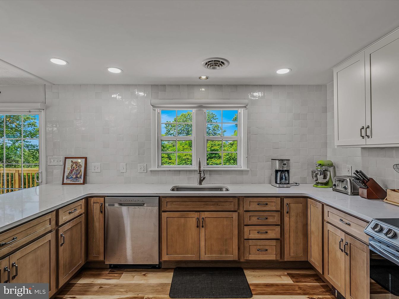 This kitchen features a practical U-shaped layout with a focus on clean, minimalist design. The countertops are a smooth white surface, contrasting warmly against natural wood cabinets that offer ample storage. A stainless steel dishwasher sits centrally below the window, which provides a bright view of greenery outside. The backsplash consists of glossy white square tiles that continue up to the ceiling, adding texture while maintaining brightness. Various small appliances, including a coffee maker, retro-style mixer, toaster, and knife block, are neatly arranged on the counters. The floor is hardwood with rich natural tones, and recessed ceiling lights illuminate the space evenly.