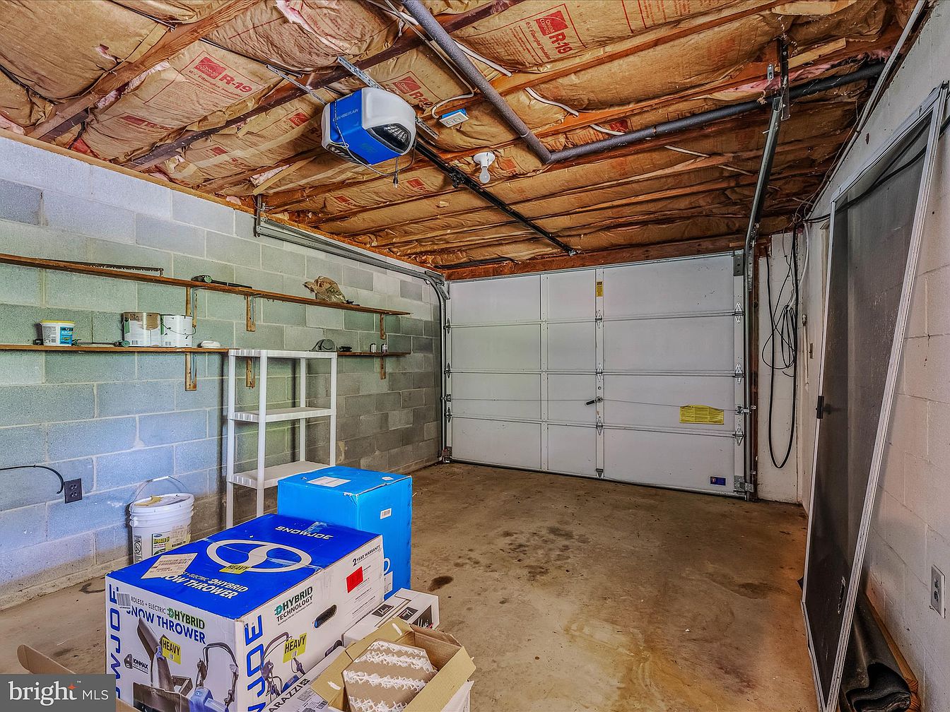 This garage features a raw, utilitarian space with exposed insulation on the ceiling and concrete block walls, lending an unfinished industrial feel. The concrete floor has visible stains and wear, typical for a working garage. Mounted wooden shelves along one wall provide basic storage, holding a few paint cans and miscellaneous items. A small white utility shelf adds extra organization potential. The white segmented garage door includes an automatic opener for convenience. Boxes and packing materials suggest recent moving or storage activities. Overall, the space is practical, offering ample room for vehicles or projects in an unpolished but functional environment.