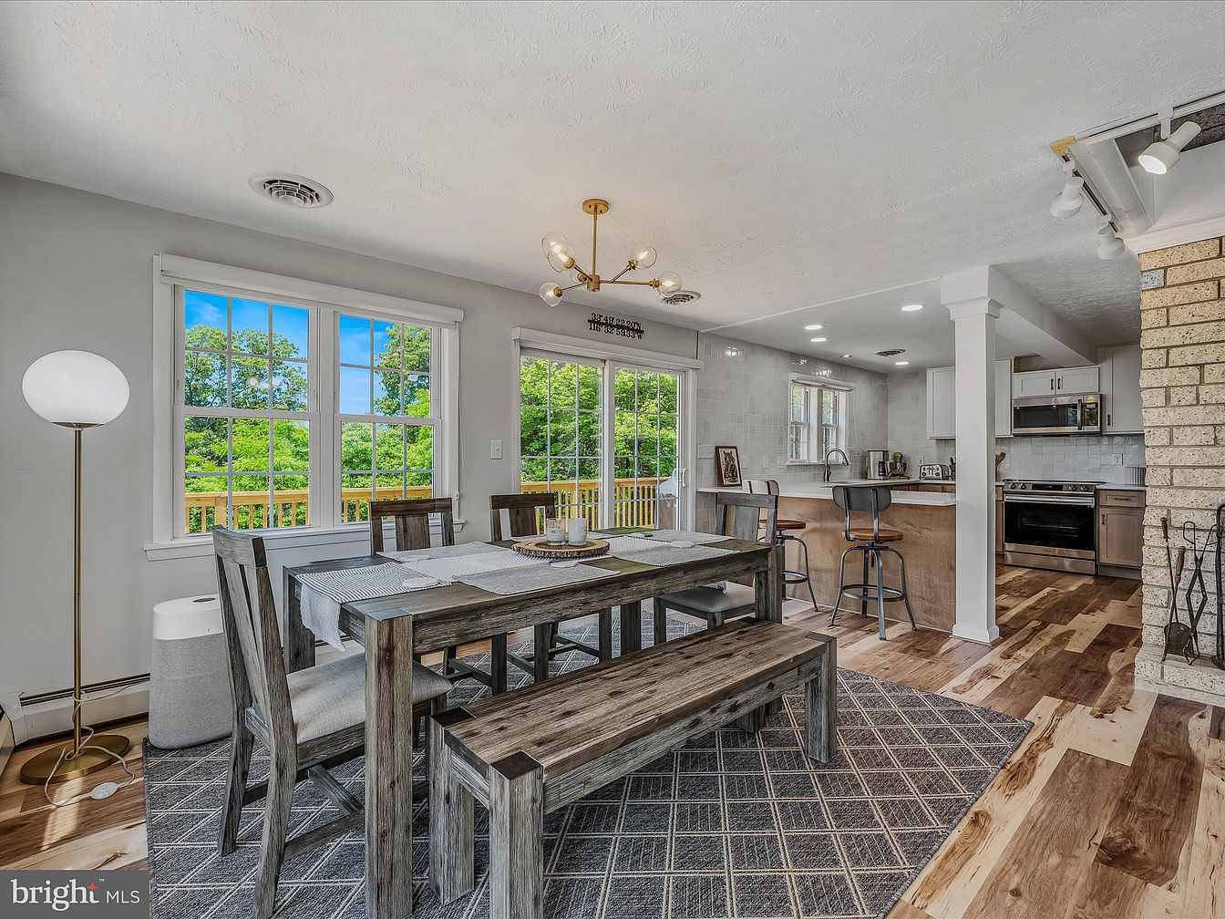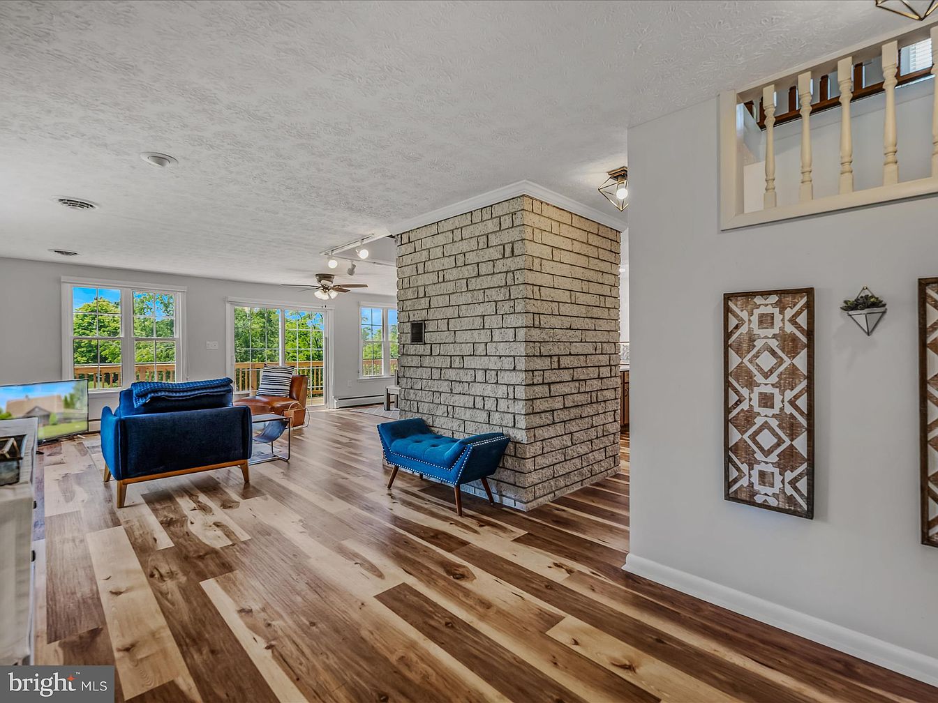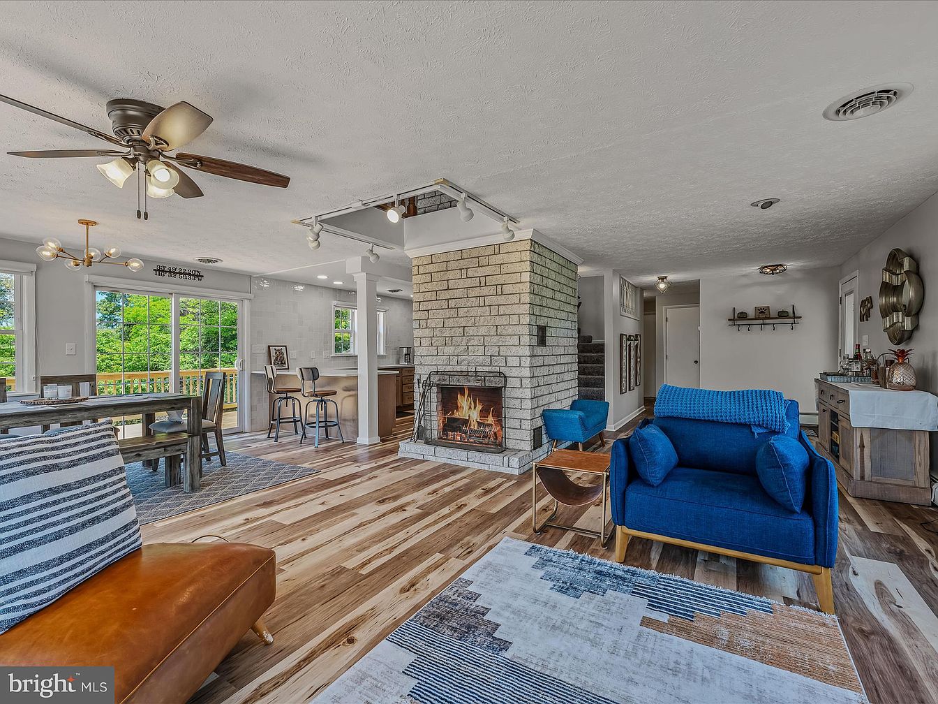 This open-concept space blends a cozy living room with a dining area, featuring warm, natural wood flooring that unifies the design. A large, centrally placed brick fireplace anchors the room, providing a rustic focal point. The living area boasts a vibrant blue loveseat with matching textured pillows and a stylish throw, accompanied by a small wooden side table. Adjacent is a leather armchair accented with striped cushions. The dining area includes a wooden bench and chairs beneath a modern gold chandelier, illuminated by natural light from sliding glass doors that open onto a deck surrounded by greenery. Neutral walls and ceiling fan lighting complete the inviting, balanced aesthetic.