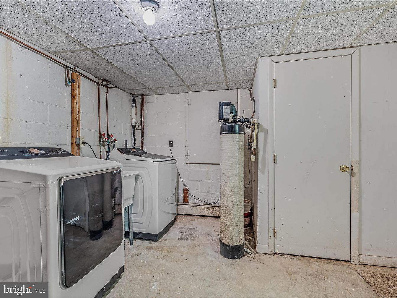 This basement laundry area features practical utility, with a white washer and dryer positioned side by side against a cinder block wall painted white. Exposed copper piping and a water softener system enhance its functional ambiance. The drop ceiling with white acoustic tiles contains a single exposed light bulb fixture, providing basic illumination. A plain white door with brass hardware is situated to the right, leading to additional storage or utility space. The concrete floor and minimal decor emphasize utilitarian use, reflecting a space designed for efficiency over aesthetics in this unfinished basement corner.