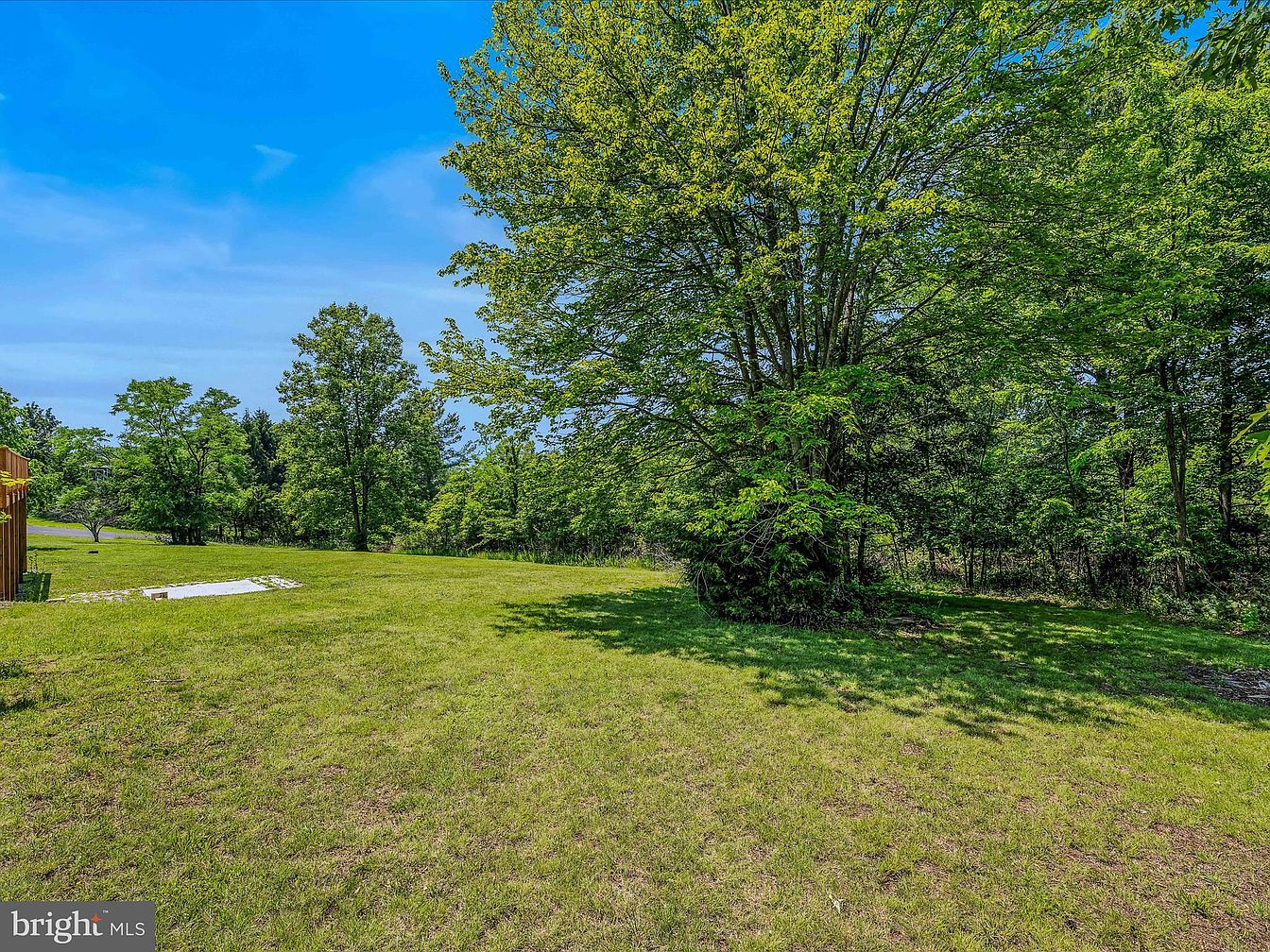 This spacious backyard is defined by a well-maintained green lawn that stretches out beneath a bright blue sky. At the heart of the yard stands a large, mature tree casting gentle shade, surrounded by additional clusters of trees and shrubbery that create a natural boundary and add privacy. The left side features a wooden fence, indicating the perimeter of the property. This open outdoor area offers a serene, natural retreat ideal for outdoor activities, relaxation, or gardening, with the vibrant greenery providing a refreshing and peaceful atmosphere.