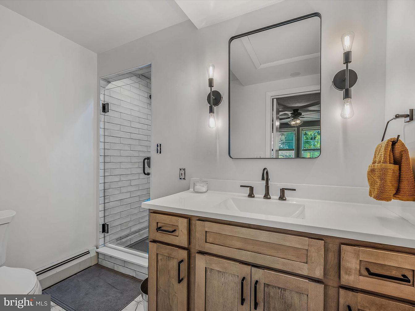 This bathroom features a clean, modern design with neutral tones. A wooden vanity with black hardware anchors the space, topped by a smooth white countertop with an integrated sink. Above the sink hangs a large rectangular mirror framed in black, flanked by two contemporary wall sconces with exposed bulbs, adding a stylish industrial touch. To the left, a glass-enclosed shower with white subway tiles and dark grout creates a bright, fresh focal point. The walls are painted a crisp white, and a mustard-colored towel on a metal ring adds a subtle pop of color against the understated palette.