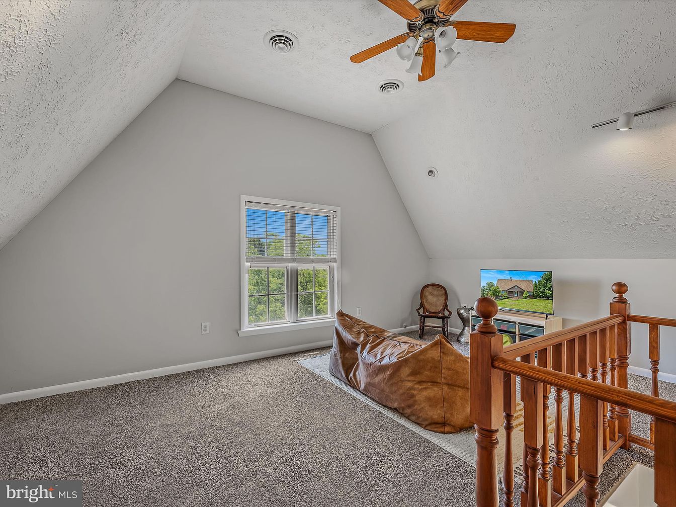 This cozy loft space features a sloped ceiling with a central ceiling fan finished with wooden blades, enhancing airflow and comfort. The walls and ceiling are painted in a soft, neutral light gray that brightens the room while providing a serene backdrop. Plush, medium-tone carpeting adds warmth underfoot. A large double window with white blinds allows natural light to flood the space and offers views of greenery outside. Furnished minimally, the area includes a large, casual leather bean bag-style couch, a classic wooden chair, and a small side table, creating a relaxed sitting nook near a wall-mounted TV. Rich wood balusters and railing at the staircase add a touch of traditional detail to the loft’s contemporary aesthetic.