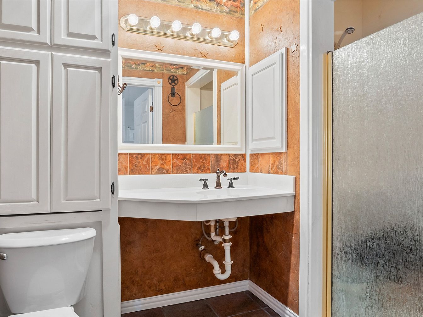 This cozy bathroom corner features a white corner vanity with an angular basin and dark bronze faucet fixtures. The walls are adorned with textured, warm brown paint complemented by a strip of decorative tile backsplash, adding rustic charm. Above the sink, a large rectangular mirror bordered in white trims reflects the light from a Hollywood-style vanity fixture with multiple globe bulbs, brightening the space. Adjacent to the vanity is a white-paneled medicine cabinet and tall storage unit, while the partially visible glass shower door with a frosted texture provides privacy. The overall aesthetic combines functionality with a warm, rustic touch.