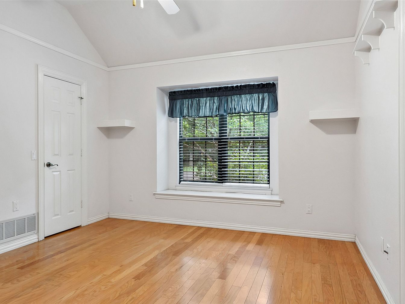 This cozy bedroom corner centers around a large recessed window framed by a subtle white trim. The window features dark blinds paired with a soft, gathered blue valance, allowing natural light to filter through while maintaining privacy. Light honey-toned hardwood flooring adds warmth and elegance, contrasting with the crisp, clean white walls and ceiling. The room includes two small floating shelves on either side of the window, providing minimal yet functional display options. Crown molding and a white paneled door with classic hardware contribute to the polished, understated aesthetic of this restful space.