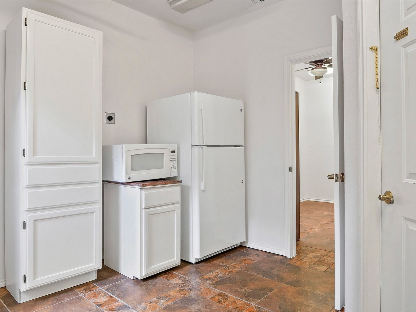 This cozy kitchen corner features a clean, minimalist design with white cabinetry and appliances that create a bright and airy atmosphere. The space is anchored by a compact white refrigerator and a microwave set atop a small counter cabinet with a dark granite countertop, contrasting subtly with the white accents. The walls and doors are painted in neutral white, enhancing the sense of openness. Distinctive brown-toned floor tiles add warmth and texture, complementing the sleek modern elements. An open doorway leads to an adjoining room visible with a ceiling fan, suggesting a logical flow between spaces.