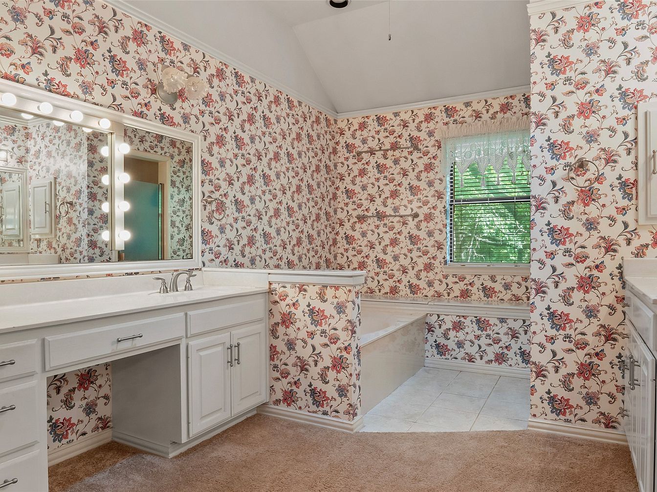 This bathroom presents a classic, vintage aesthetic with prominent floral wallpaper featuring red, blue, and beige tones. A large vanity with white cabinetry spans the left side, offering ample storage and space beneath for seating. The countertop is simple, complementing the overall white theme. Above the vanity, a mirror framed by exposed bulb vanity lights adds a glamorous, old-Hollywood touch. In the back corner, a built-in bathtub is surrounded by matching floral wallpaper and tiled flooring, creating a cozy nook. Natural light filters through a window dressed with a delicate lace valance, enhancing the room’s nostalgic charm and warmth.