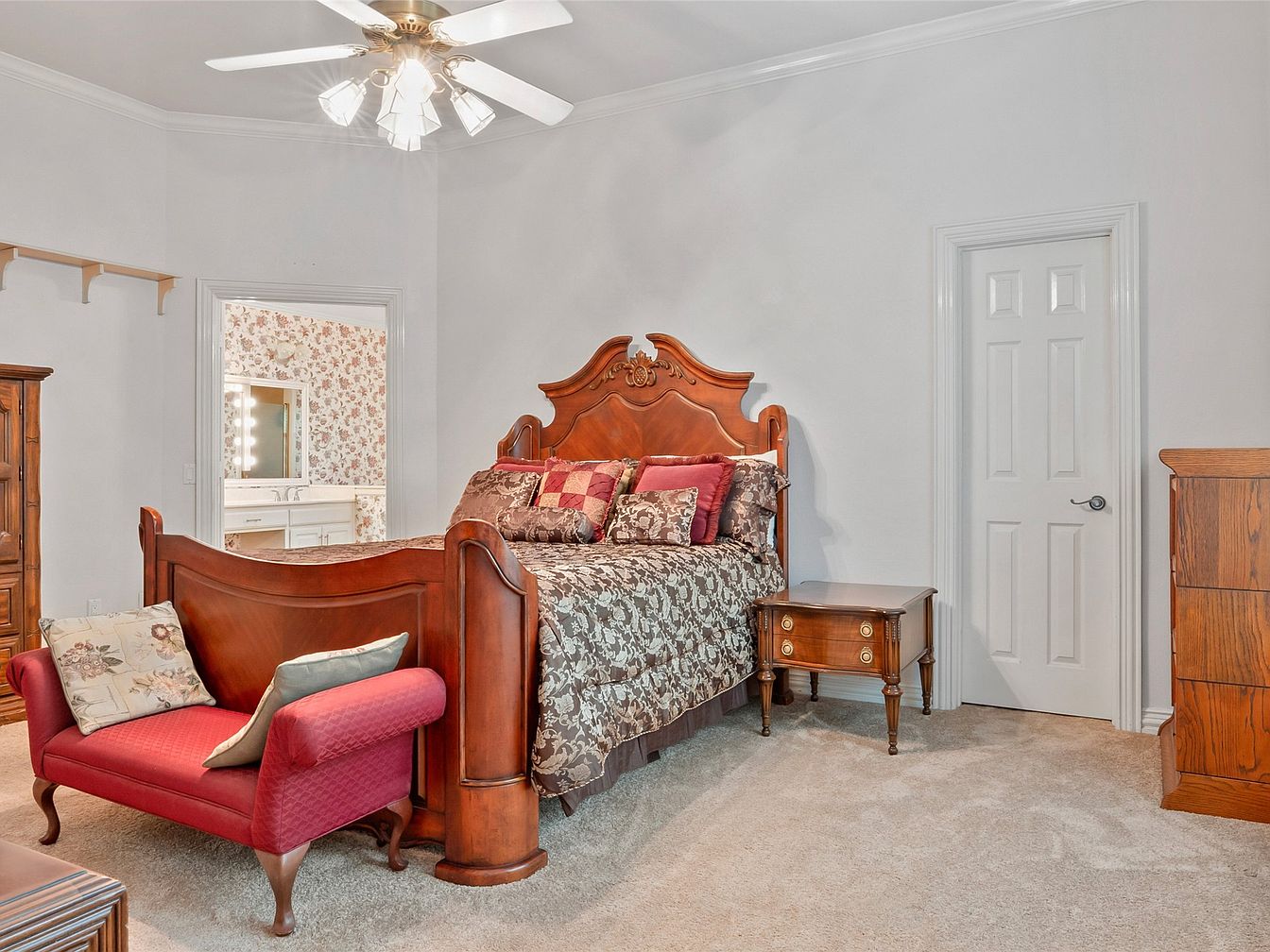 This master bedroom exudes a traditional charm with richly carved wooden furniture dominating the space. The large bed features an ornate headboard and matching footboard, all in a warm cherry wood tone complemented by a deep floral comforter topped with an array of decorative pillows in muted reds and earth tones. A classic wooden nightstand with brass pulls sits beside the bed, while a small upholstered loveseat in deep red with elegant wooden legs provides a cozy seating area. Walls are painted soft off-white to highlight the furniture’s craftsmanship. The doorway opens to a glimpse of a bathroom with floral wallpaper, adding a touch of vintage character to the suite.
