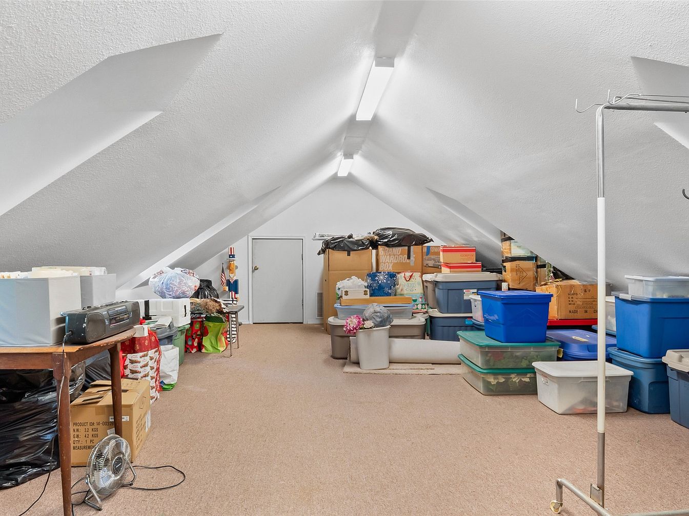 This attic features a sharply pitched ceiling with clean white walls and bright overhead fluorescent lighting. The space is carpeted in a neutral beige tone, creating a warm foundation despite the utilitarian function. It serves primarily as an organized storage area, with numerous plastic storage bins and cardboard boxes stacked neatly on both sides. A small wooden table on the left holds additional items including a portable radio and fan. The room’s layout is long and narrow, suited for storing seasonal décor and household goods, highlighted by the small door at the far end providing access or additional storage.