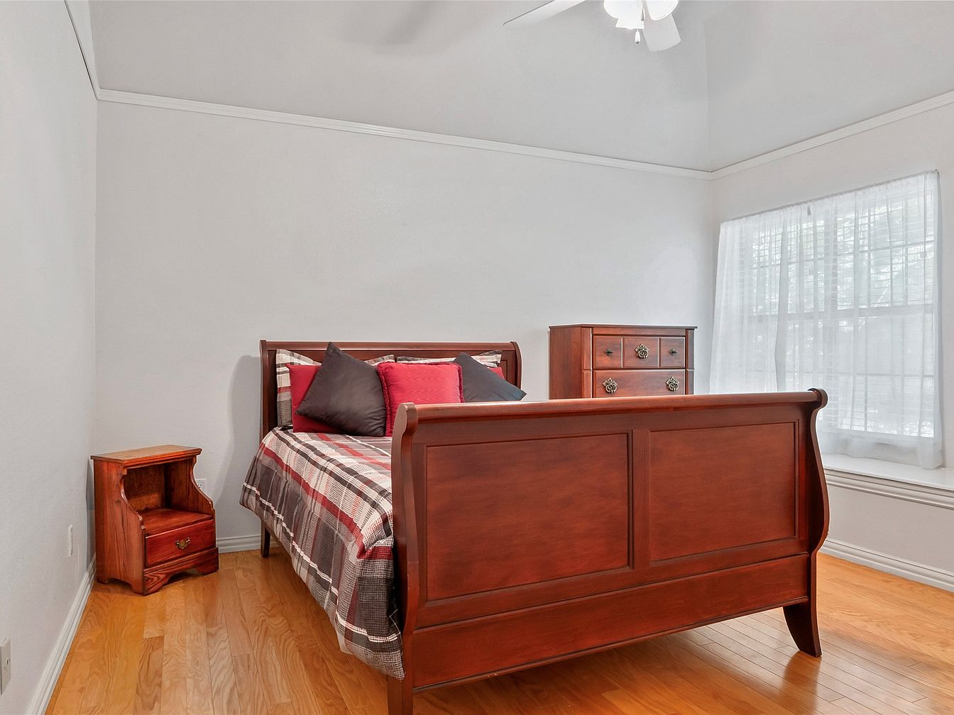 This bedroom features a classic design with a rich, reddish-brown wooden bed frame as the focal point. The bed is dressed in a plaid-patterned comforter with hues of gray, beige, and red, complemented by a mix of solid red and dark gray throw pillows for contrast. The room’s flooring is warm-toned hardwood, adding to the inviting atmosphere. A matching nightstand with a small drawer sits beside the bed, while a chest of drawers stands near the window, which is adorned with sheer white curtains that allow natural light to fill the space softly. The walls are painted in clean white, enhancing the room’s brightness and simplicity.