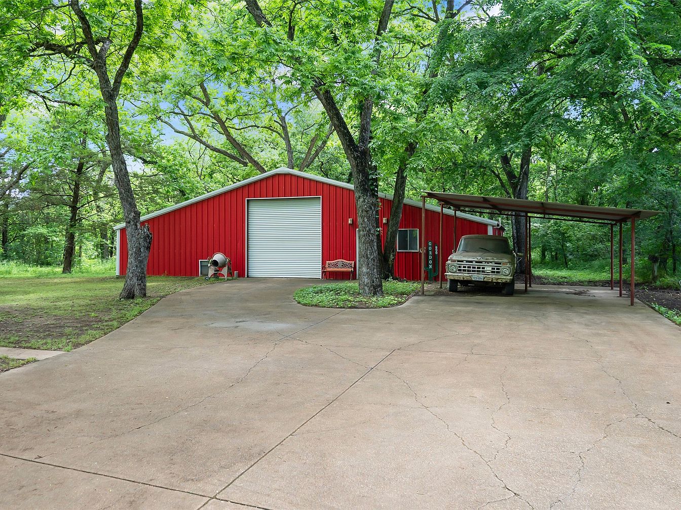 This spacious outdoor section features a bold red metal garage with a large white roll-up door, framed by lush greenery and mature trees offering ample shade. Adjacent to the garage is a simple metal carport structure supported by slender posts, providing covered parking space for an older vintage truck, which adds rustic charm. The concrete driveway is expansive and gently curved, showing natural wear and cracks that enhance the countryside ambiance. A small bench and a cement mixer near the garage emphasize practicality and a working property feel. The surrounding natural woodland creates a peaceful and private setting.