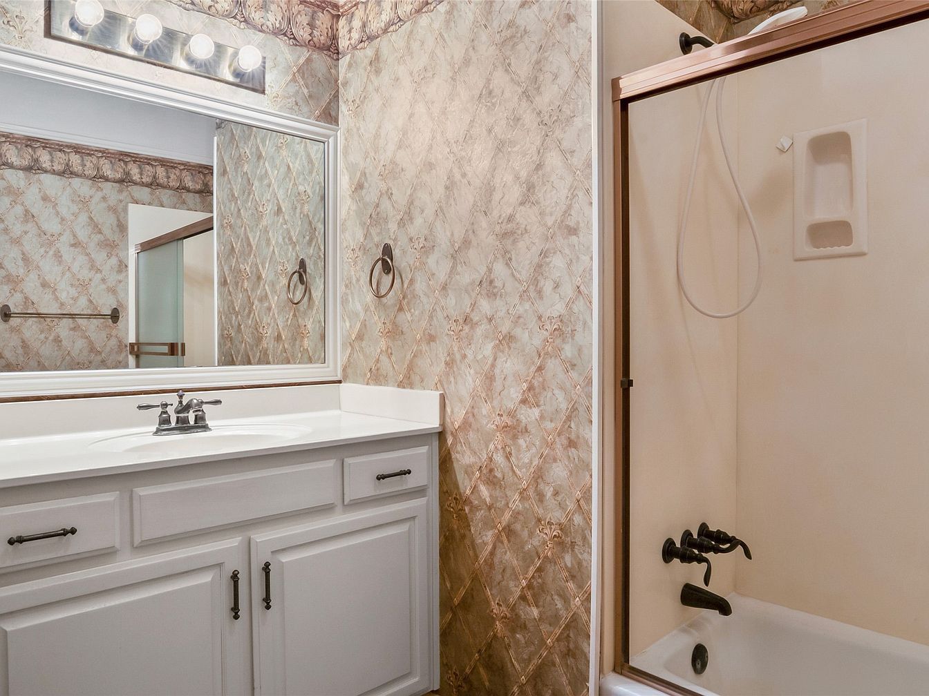This bathroom features a white vanity with paneled cabinetry and dark hardware that contrasts subtly yet effectively with the neutral tones of the space. A large, framed mirror sits above the sink, equipped with a row of classic globe vanity lights providing ample illumination. The walls present a textured wallpaper with a diamond pattern in muted beige and brown hues with hints of gold fleur-de-lis accents, adding an elegant and vintage touch. Adjacent to the vanity is a bathtub with cream-colored surrounds, bronze fixtures, and a sliding glass door with bronze trim, complementing the warm color palette and refined design.