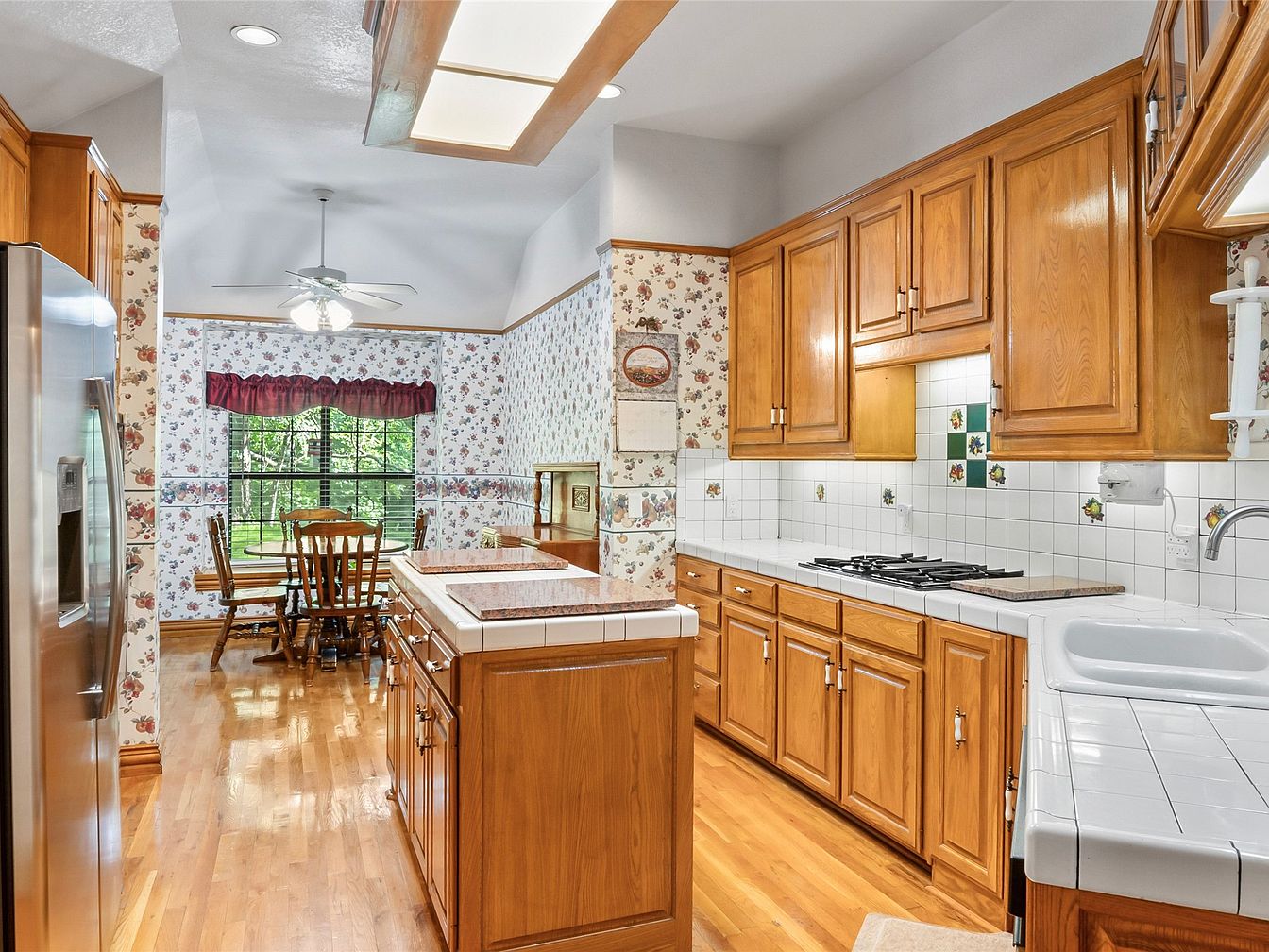 This warm, inviting kitchen features natural wood cabinetry with a honey finish, contrasted by white tile countertops and backsplash accented with colorful floral tiles. A centrally located island offers additional workspace and storage with a similar tile surface. The kitchen extends into a bright breakfast nook where a round wooden dining table and matching chairs sit beneath a ceiling fan with light. Walls are decorated with floral wallpaper bordered by coordinating trim, enhancing the cozy, classic aesthetic. Large windows with a red valance overlook a lush green outdoor view, filling the space with natural light and soft ambiance.