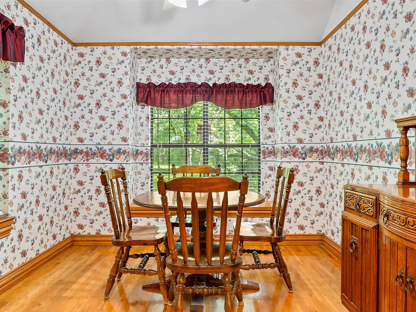This inviting dining space features a round wooden table encircled by four traditional spindle-back chairs, all resting on honey-toned hardwood floors. The walls are adorned with vintage floral wallpaper, showcasing small clusters of fruits and flowers in soft reds and greens, complemented by a matching horizonal border mid-wall. Natural light filters through a large window, framed by wooden blinds and topped with a deep burgundy valance, casting a warm glow across the room. A sturdy sideboard with carved details anchors the corner, enhancing the room’s classic rustic charm and homely atmosphere.