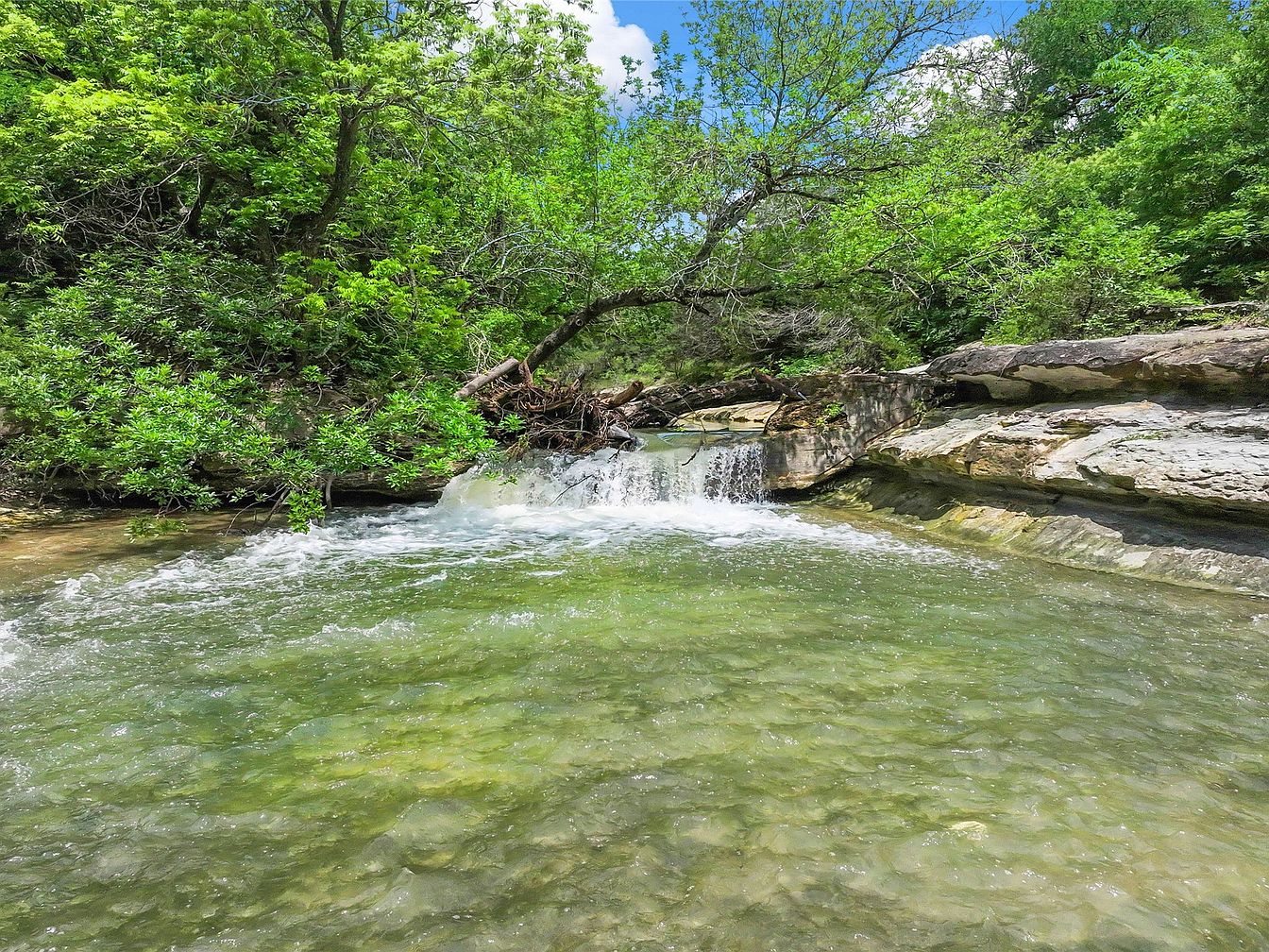 This outdoor area highlights a serene creek, an inviting natural element that could be an exquisite part of the property’s surrounding land. Clear, gently flowing water cascades over a modest rock ledge, creating soft waterfalls that add movement and sound to the peaceful environment. The creek is flanked by lush green foliage and mature trees providing ample shade, while natural rock formations accentuate the terrain. Bright sunlight illuminates the vibrant greens and sparkling water, conveying a tranquil, refreshing atmosphere that blends harmoniously with the natural landscape of this charming home estate.