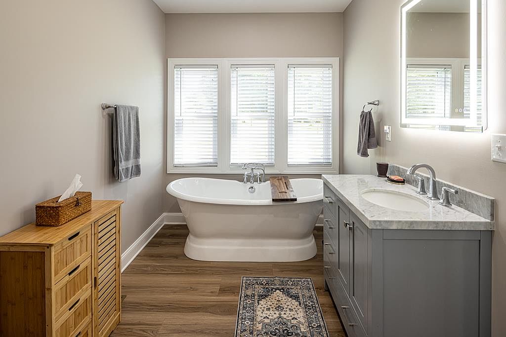 This bathroom features a serene and clean design, centered around a freestanding white bathtub positioned beneath three large, bright windows with white blinds, flooding the room with natural light. The calming neutral walls highlight a harmonious blend of modern and rustic elements. On one side, a sleek gray vanity with marble countertop and under-mount sink boasts minimalist chrome fixtures alongside a backlit mirror, enhancing the space’s contemporary vibe. The floor showcases warm wood-like planks, complemented by a vintage-style area rug, while a natural wooden cabinet with woven details adds inviting texture and warmth. Subtle touches like gray towels bring cohesion and understated elegance to this tranquil sanctuary.