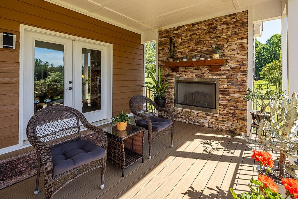 This inviting covered porch features a warm, rustic charm with its natural stone fireplace as the focal point, perfect for chilly evenings outdoors. The floor is finished with wide, wooden planks in a light brown tone that complements the wood-paneled wall in a slightly darker hue. A pair of cushioned wicker chairs and a matching wicker side table create a cozy seating arrangement. Decorative plants and vibrant red flowers in pots add fresh greenery, while a glass-paned double door connects this space seamlessly to the interior. The ambiance blends nature with comfort, perfect for relaxation or socializing.